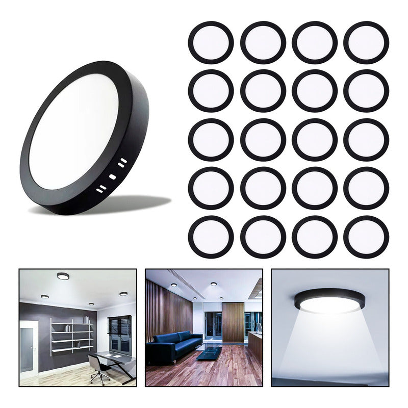 20 Foco Plafon Sobrepuesto Redondo 12w Luz Fria Borde Negro