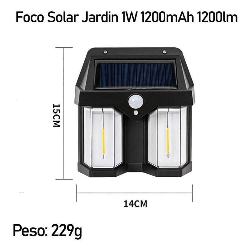 Foco Led Solar Doble Para Jardin Con una potencia de iluminacion de hasta 1W por foco, con una alta fidelidad de iluminacion y un sensor de movimiento con una sensibilidad de hasta 8 metros posee ademas una proteccion de grado IP66 el cual le permite dejarlo afuera en el jardin aun si llueve y seguir funcionando con total normalidad, una opcion practica, economica y de gran utilidad para tu hogar.