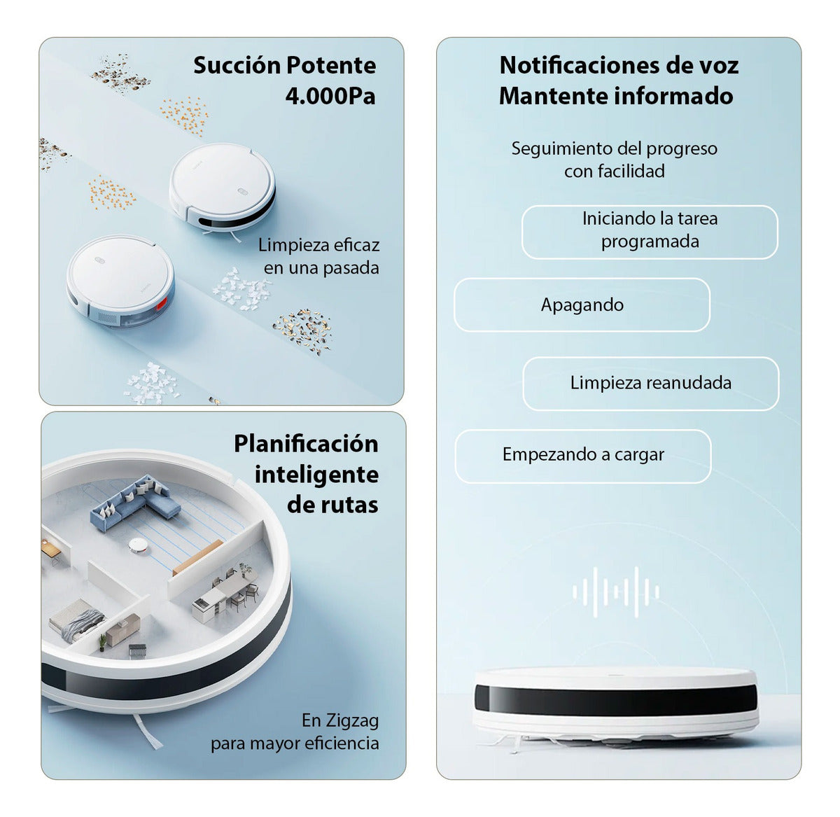 El control inteligente a través de la aplicación MiHome / Xiaomi Home te permite programar limpiezas, ajustar configuraciones y monitorear el progreso desde cualquier lugar. Con compatibilidad con Google y Alexa, puedes controlar tu E10 con simples comandos de voz, integrándose perfectamente en tu ecosistema de hogar inteligente.