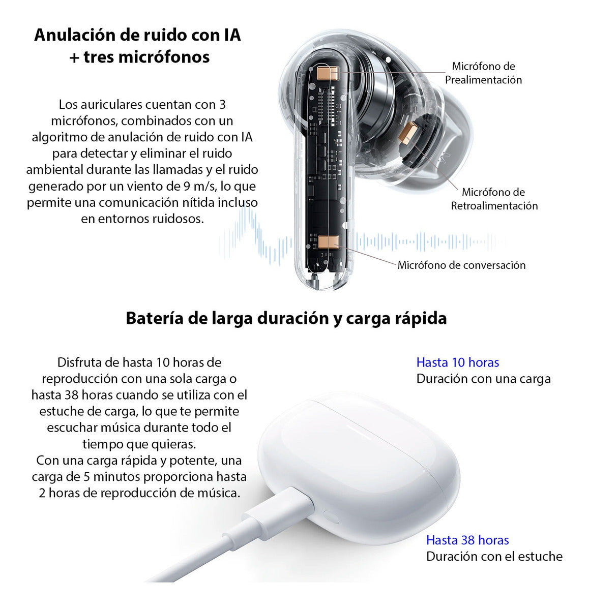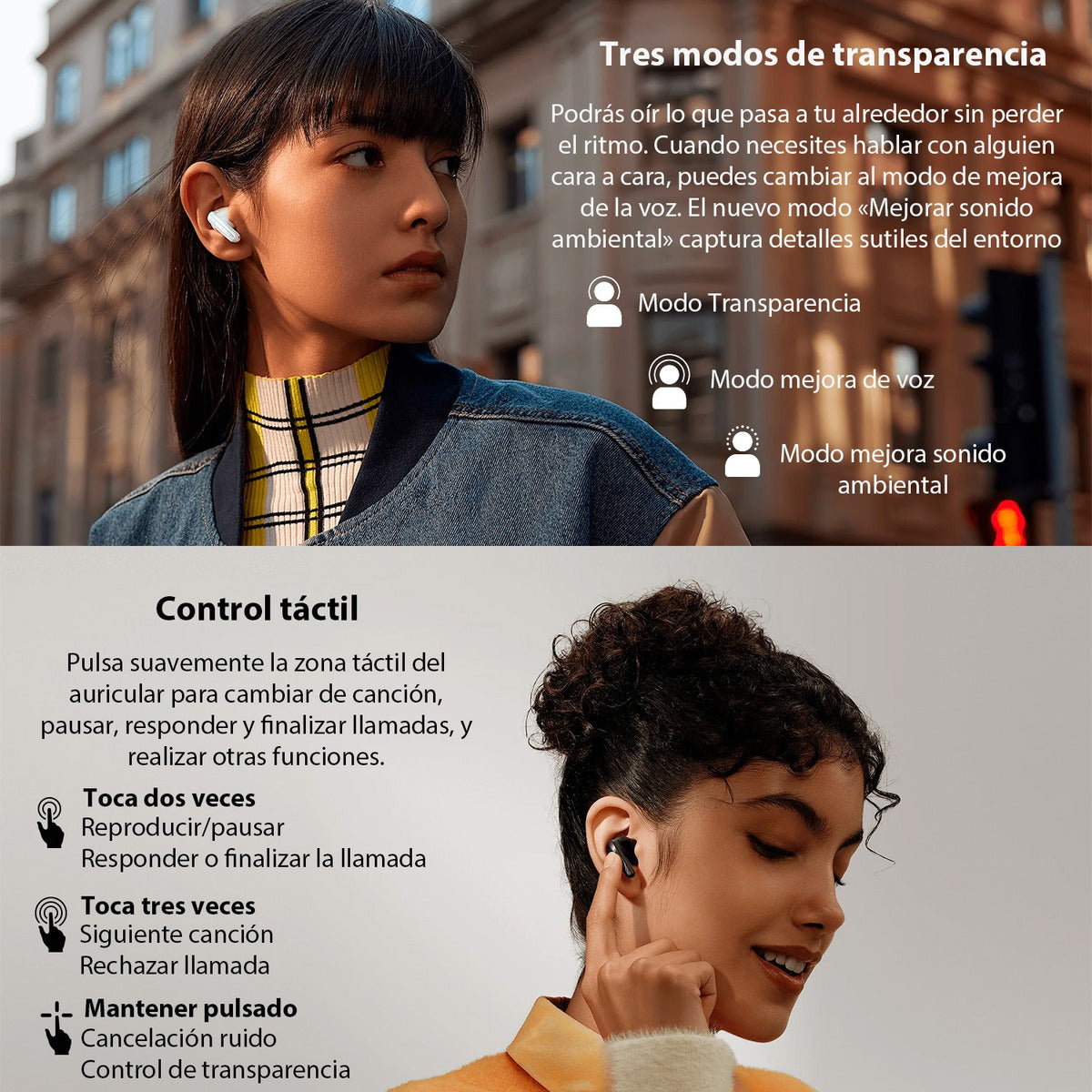 - Con 3 modos de transparencia: Modo normal, Modo mejora de voz, Modo sonido ambiental mejorado