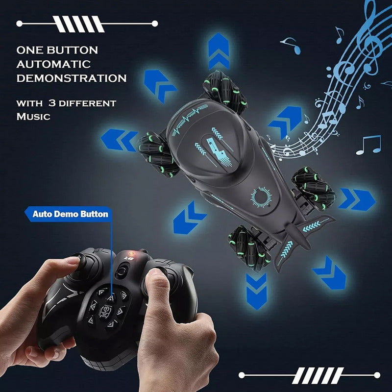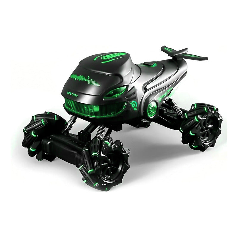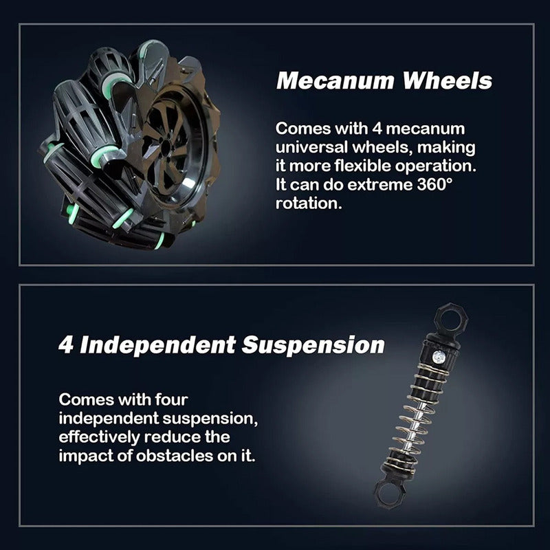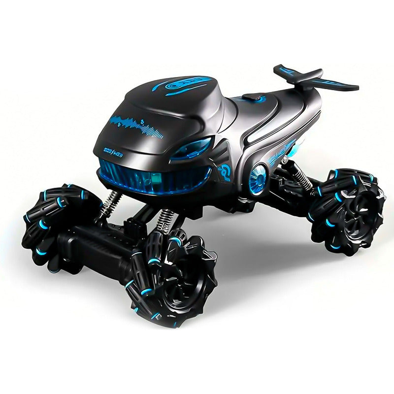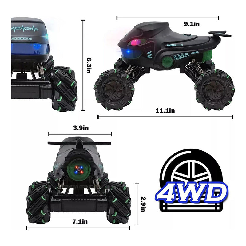 Auto a Control Remoto 4x4 con turbina, el cual te permite conducir el vehiculo en cualquier direccion, sus neumaticos cuentan con neumaticos con rodamientos lo cual le permite al vehiculo desplazarse a los lados de una manera mas rapida que los autos a control remoto convencionales.