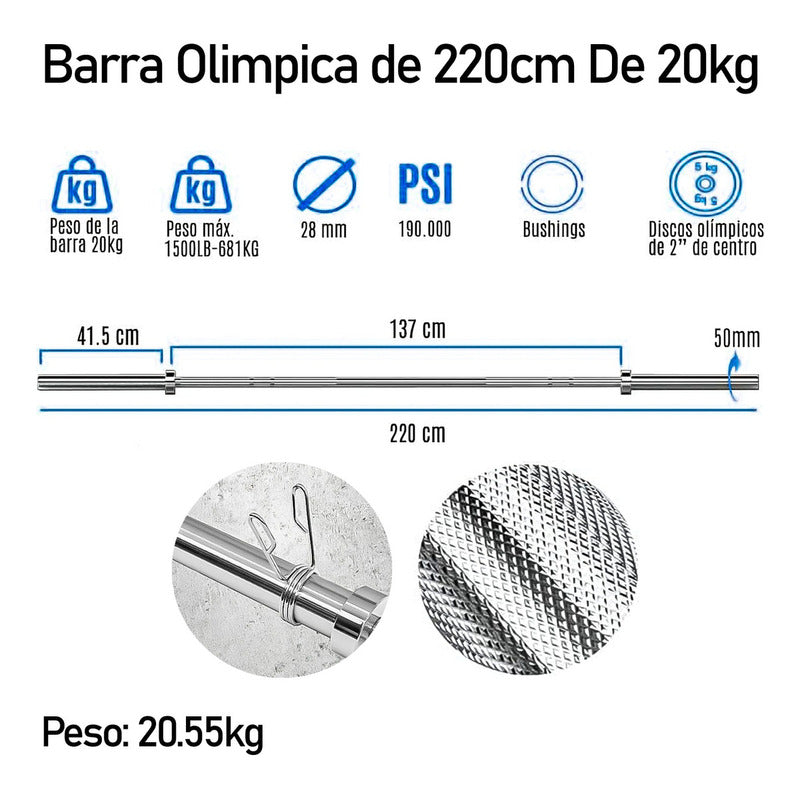 Esta barra recta Olímpica de acero cromado es ideal para tus entrenamientos de fuerza. Con un peso de 20.55 kg y una capacidad de carga de hasta 681 kg, es resistente y versátil. Su diseño de 220 cm de largo y agarre de 25 mm ofrece un entrenamiento cómodo y efectivo. Incluye mariposas para un ajuste seguro de los discos. Perfecta para realizar una variedad de ejercicios como press de banca, curl de bíceps y más.
