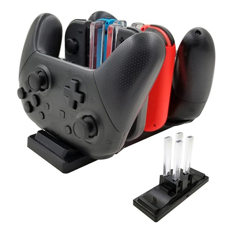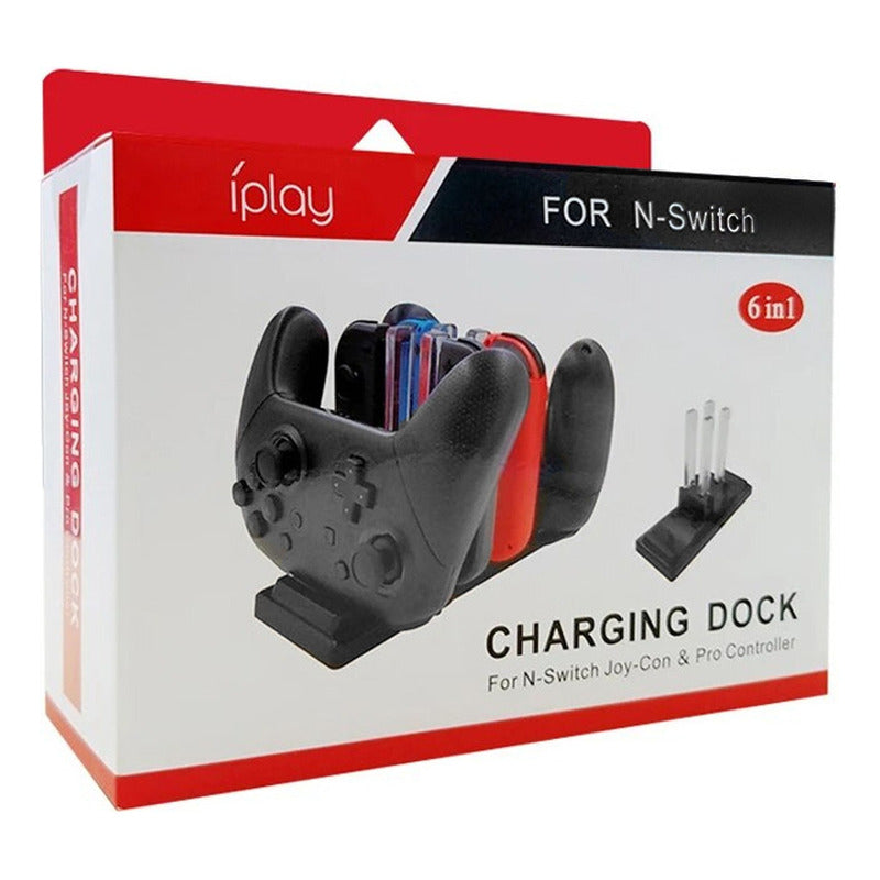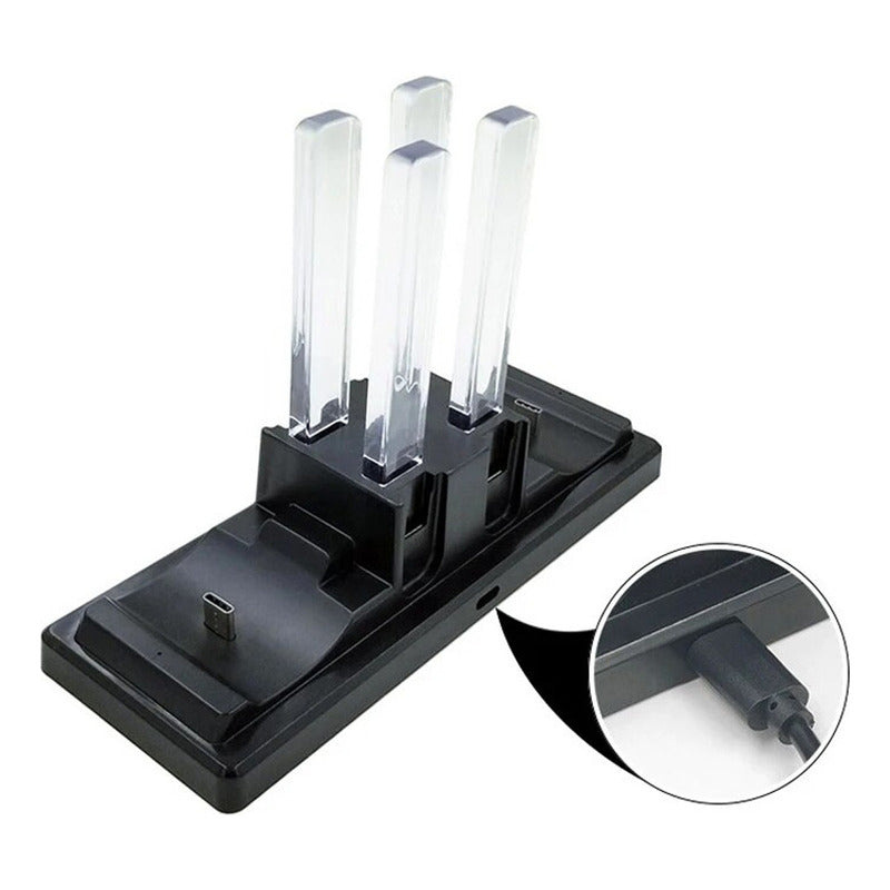 Base de carga Compatible con controles de N-Switch de la Marca Iplay, con indicadores LED intuitivos. La luz roja indica que los controles están cargando, cambiando a verde cuando la carga está completa. Equipada con voltaje de entrada tipo C de 5V DC, y una corriente de carga de 500MA * 4 para cargar hasta cuatro controles simultáneamente. Fabricada con material ABS para una construcción duradera y confiable.