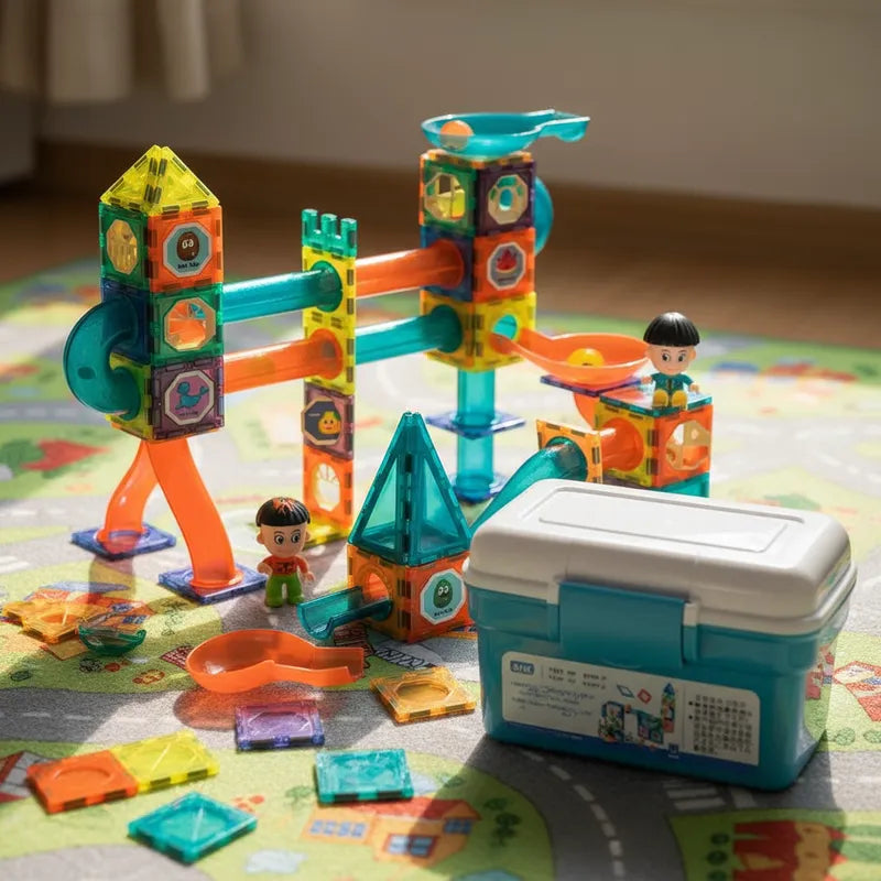 Bloques Magneticos 2 en 1 Tobogan De Bolas 3d Con Balde De 132pzs