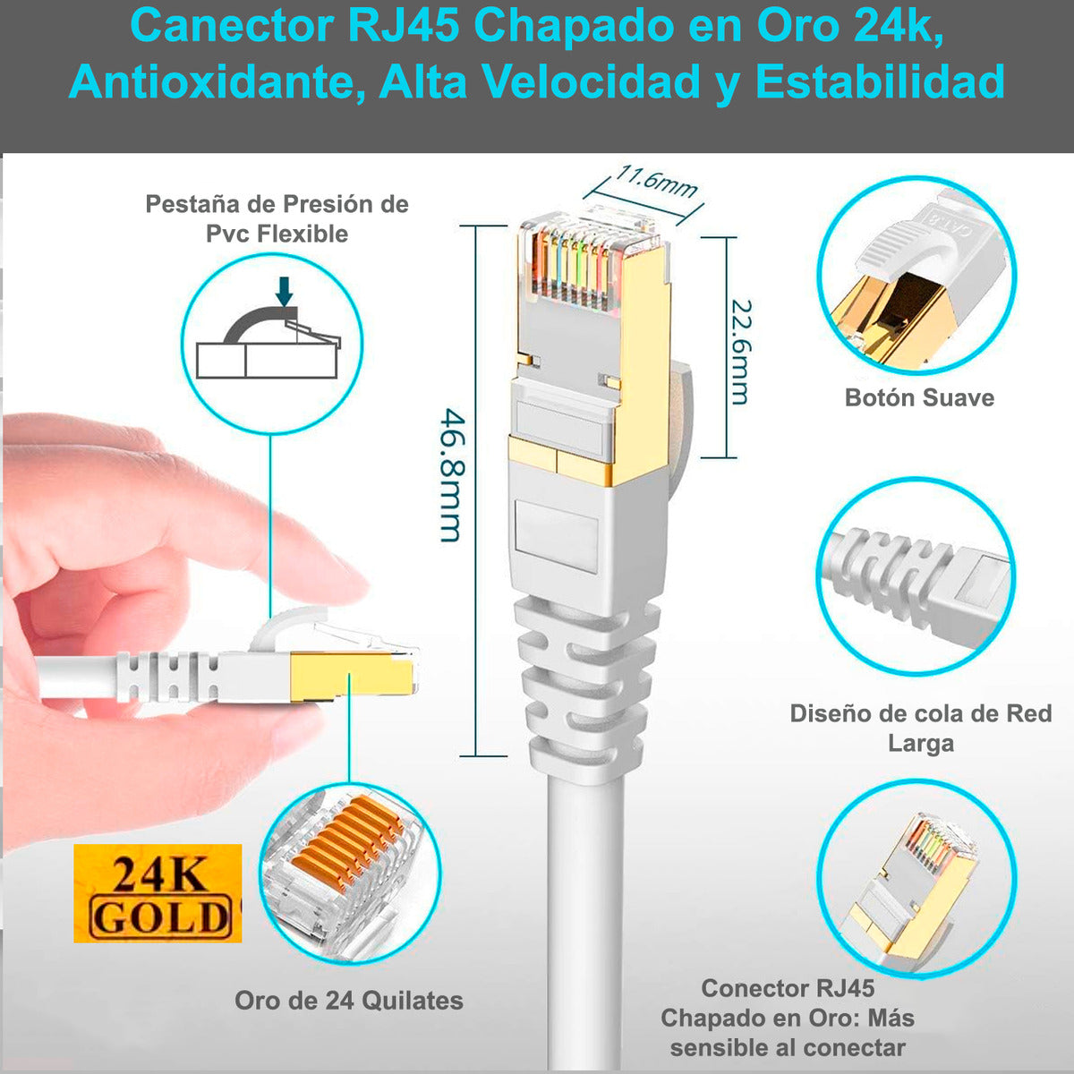 Con conectores RJ-45 Capados en Oro de 24 Kilates en ambos extremos, este cable SFTP asegura una transmisión de datos eficiente y sin interferencias. Su elegante color blanco se adapta a cualquier entorno, manteniendo un aspecto limpio y profesional. ideal para configuraciones de red complejas.