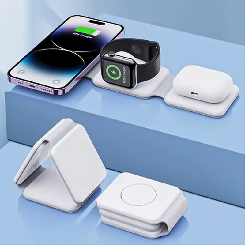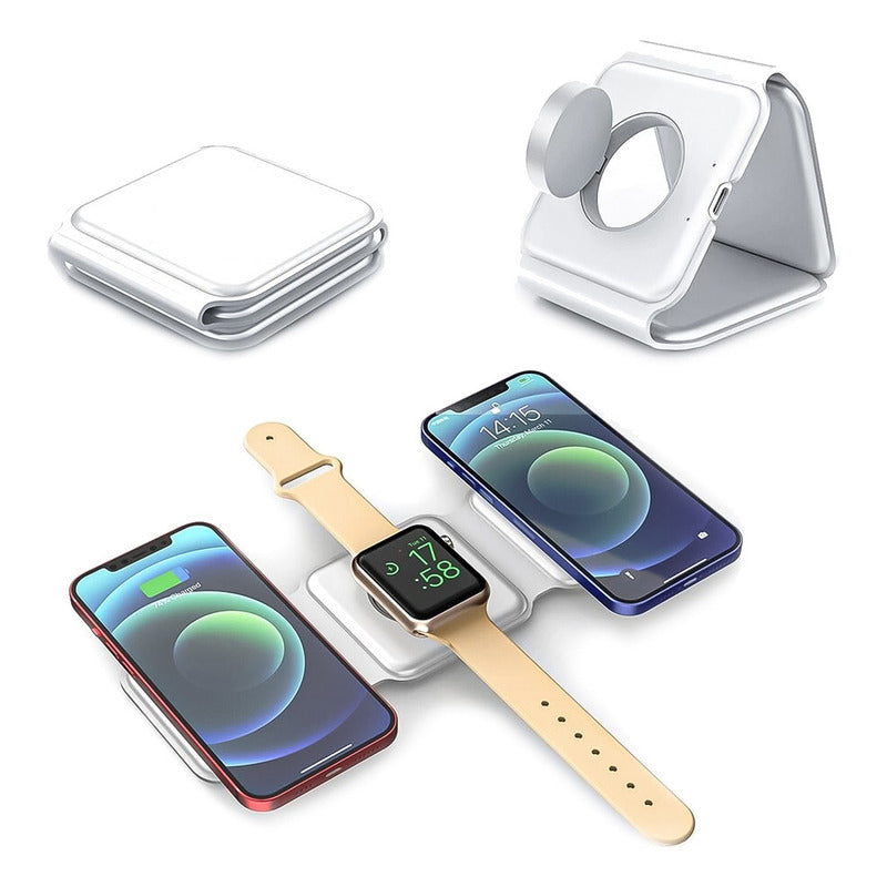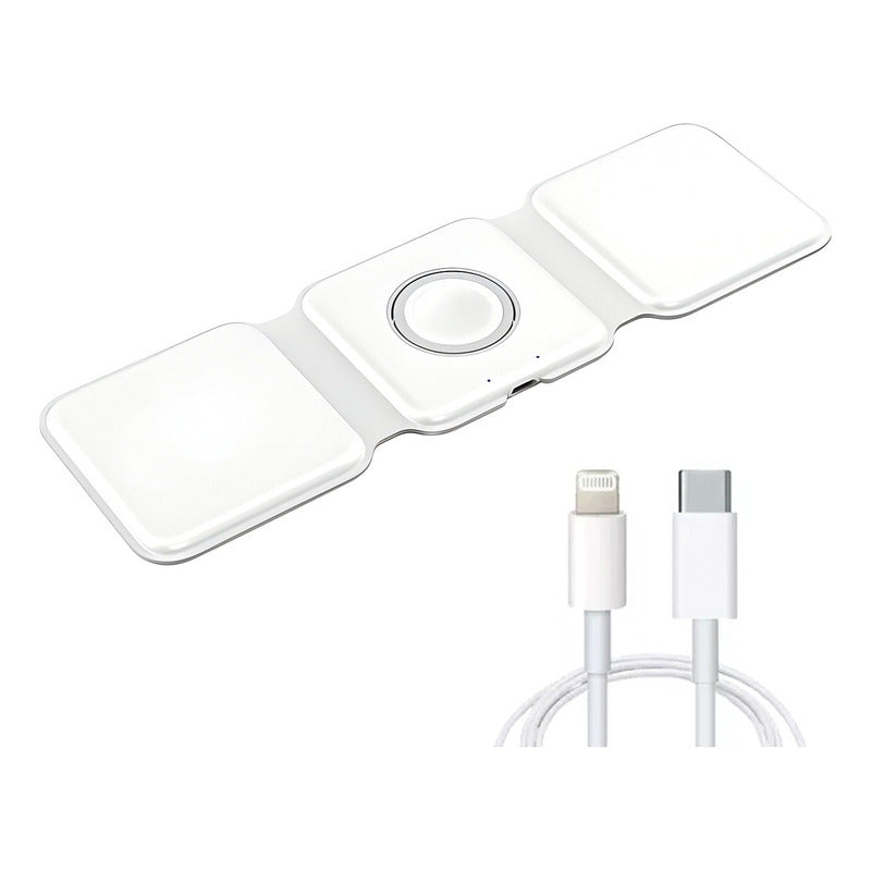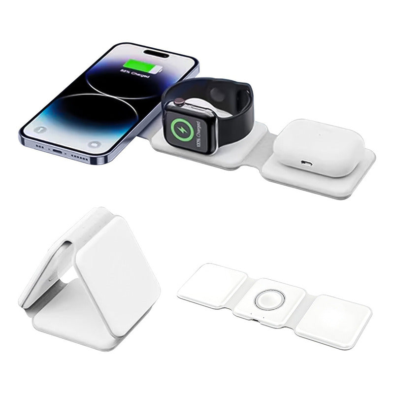 Cargador Inalambrico plegable 3 en 1, ideal para cargar tu smartphone, reloj inteligente o audifonos en cualquier lugar ya que debido a su tamaño compacto es facil de transportar, y puede cargar los tras dispositivos al mismo tiempo, su superficie imantada le permite adherirse al telefono para cargarlo de una manera mas segura.