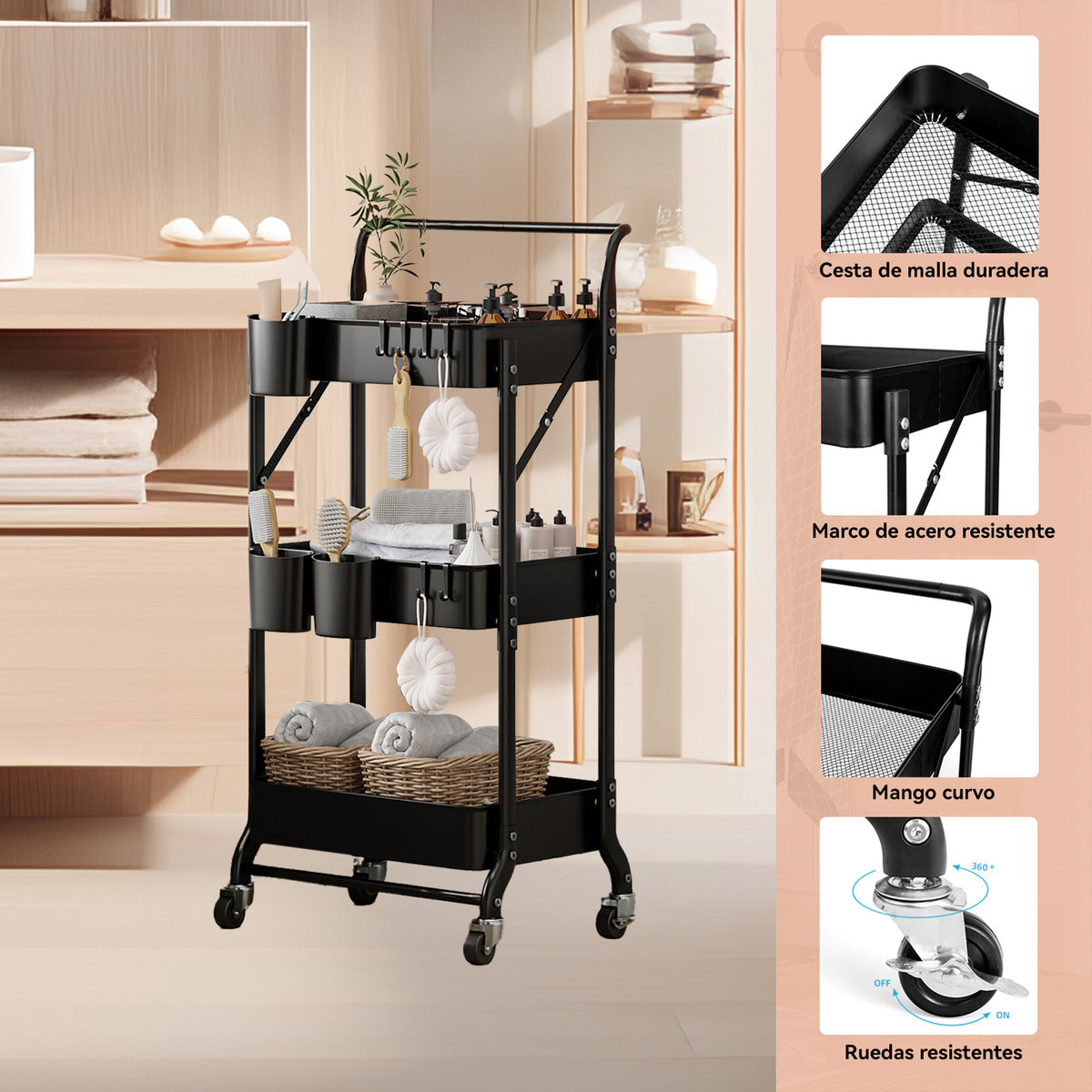 Este carrito con ruedas de metal de 3 niveles ofrece un amplio espacio de almacenamiento para organizar sus elementos esenciales, mientras que su diseño plegable permite un fácil almacenamiento cuando no está en uso. Este carrito con ruedas plegable,
