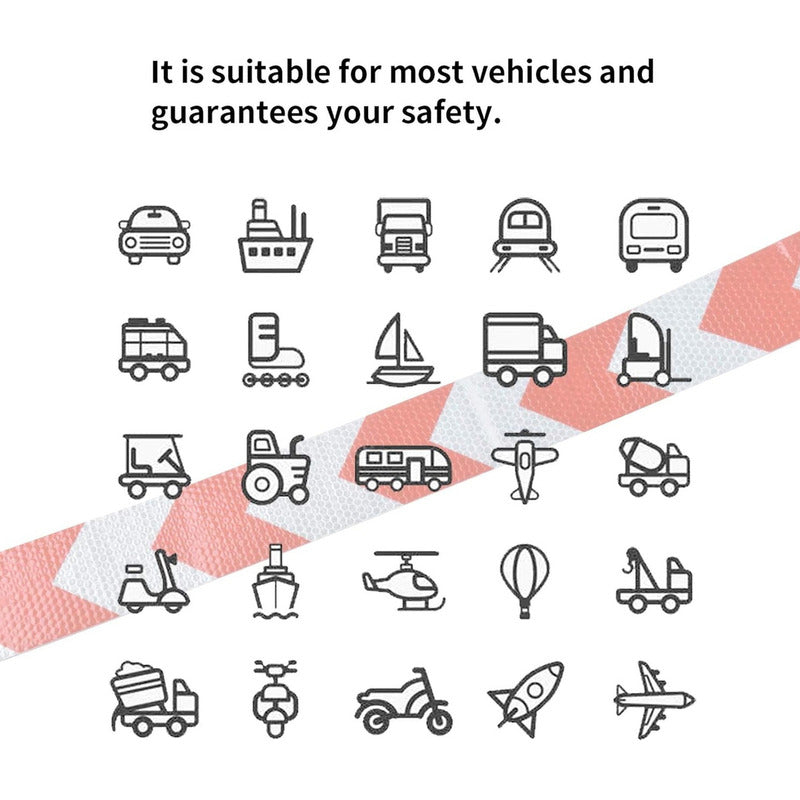 Cinta Reflectante de flecha Blanco con Rojo, de 25 metros de largo con 5cm de ancho de Alta Intensidad con propiedad adhesiva para cualquier tipo de superficie, función de pegatina de seguridad para automóviles, vehículos pesados o maquinarias de carga.