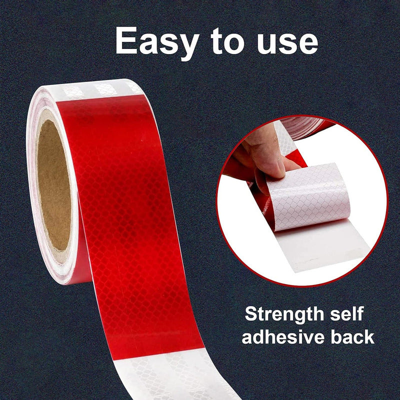 Cinta Reflectante de color Blanco con Rojo, de 25 metros de largo con 5cm de ancho de Alta Intensidad con propiedad adhesiva para cualquier tipo de superficie, función de pegatina de seguridad para automóviles, vehículos pesados o maquinarias de carga.