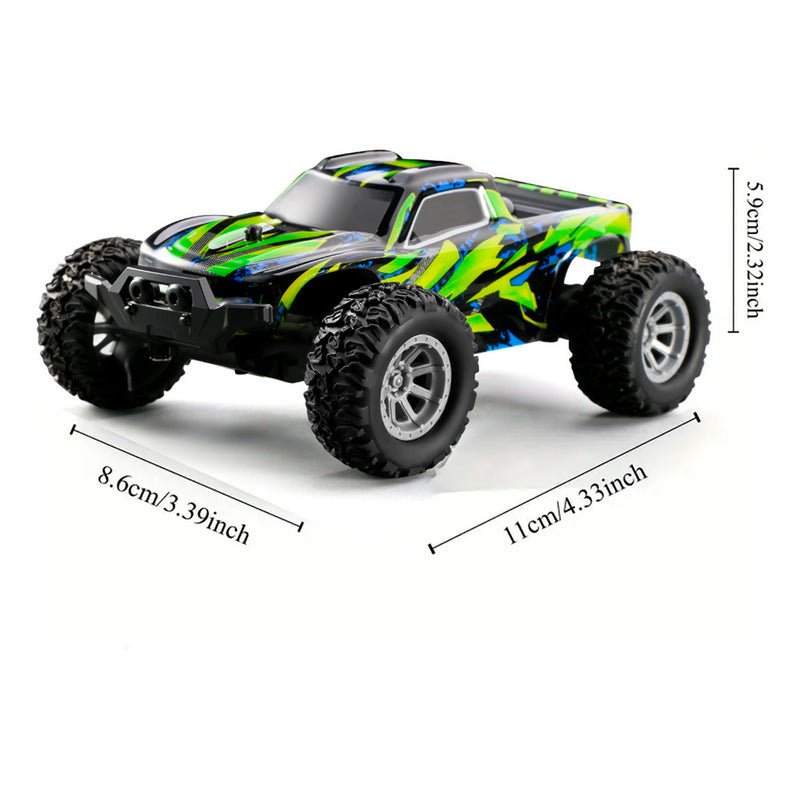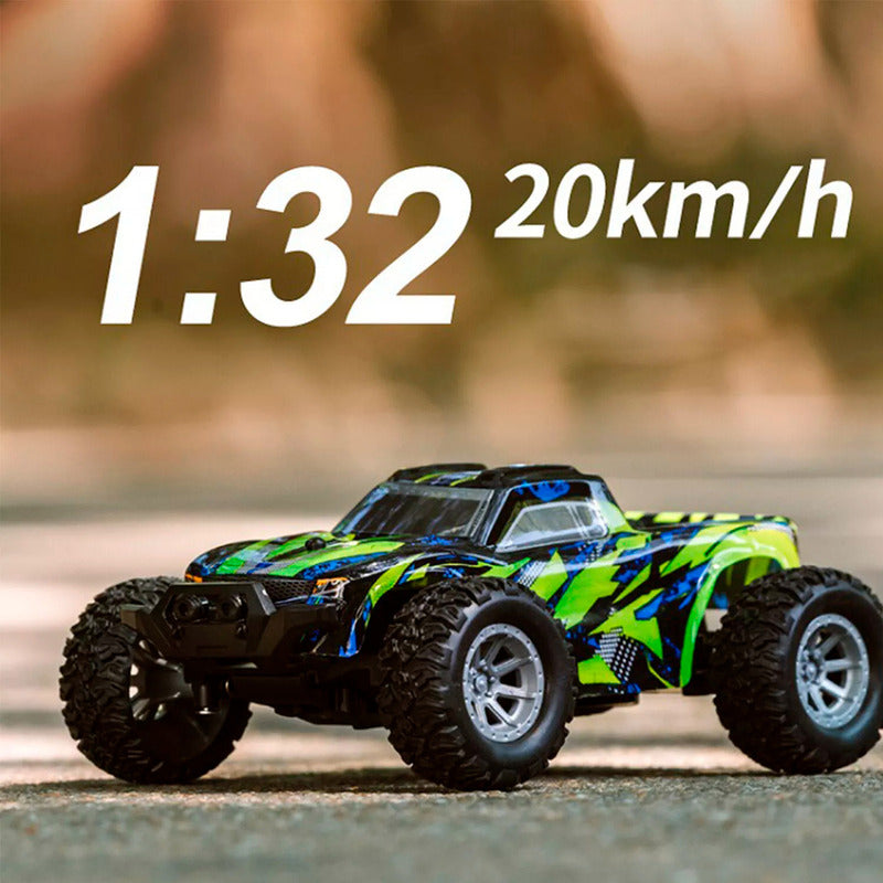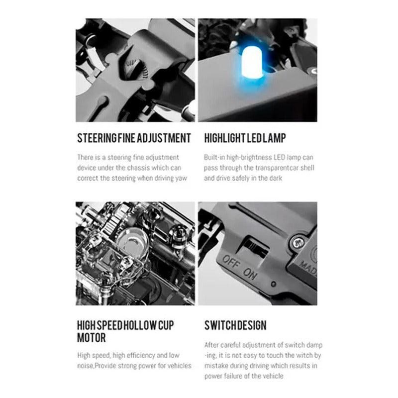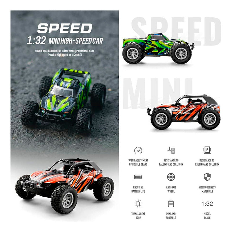 1. Escala y Tracción: Este coche a escala 1/32 tiene tracción en dos ruedas (2WD), lo que le proporciona un buen equilibrio entre maniobrabilidad y velocidad