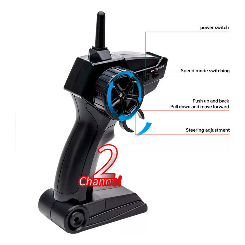 3. Control Remoto: Utiliza un sistema de control remoto de 2.4 GHz, lo que permite una operación sin interferencias y una distancia de control de hasta 30 metros, proporcionando un control preciso del vehículo