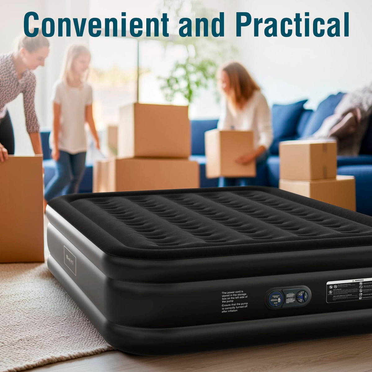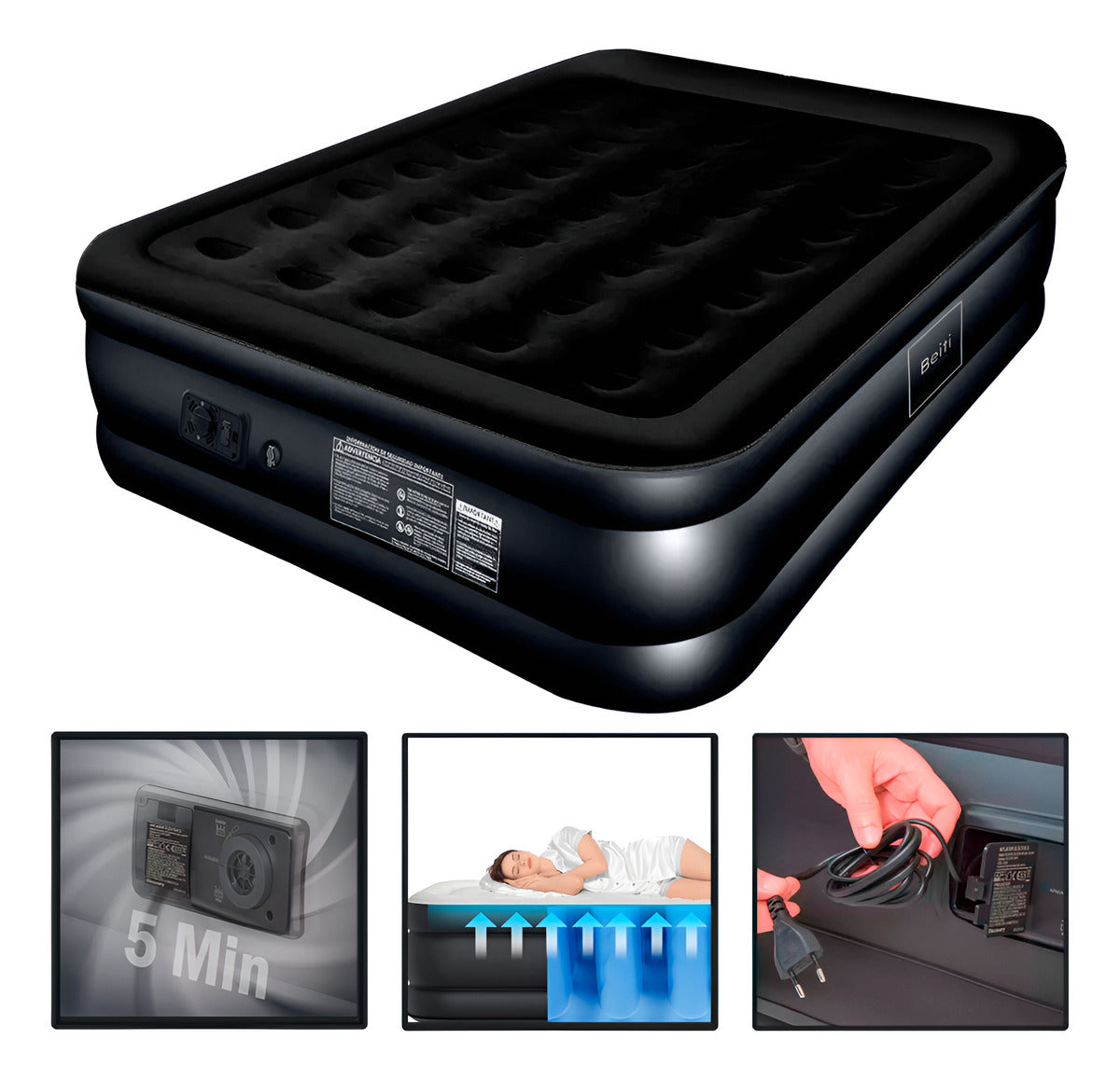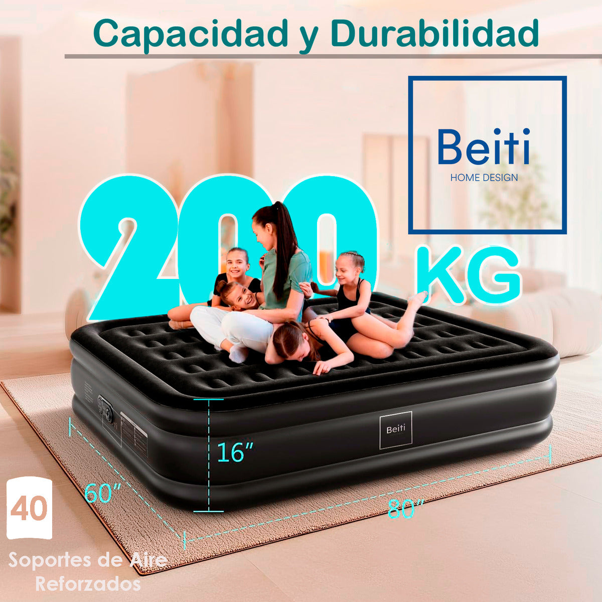 El Colchón Cama Inflable Queen Beiti, tiene un tamaño de dos plazas, una altura de cama elevada de 45 centímetros y un ancho de 152 centímetros. Ideal para parejas o familias que busquen comodidad a la hora de dormir, siendo capaz de soportar un peso de hasta 200 kilos. Para mayor suavidad, cuenta con una cubierta superior afelpada y un marco de soporte circundante superior e inferior que le otorga mayor estabilidad.