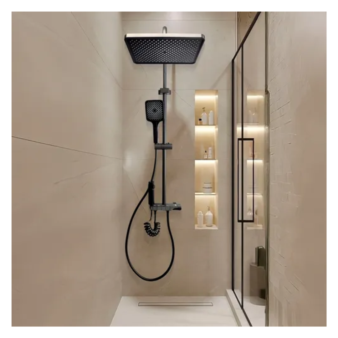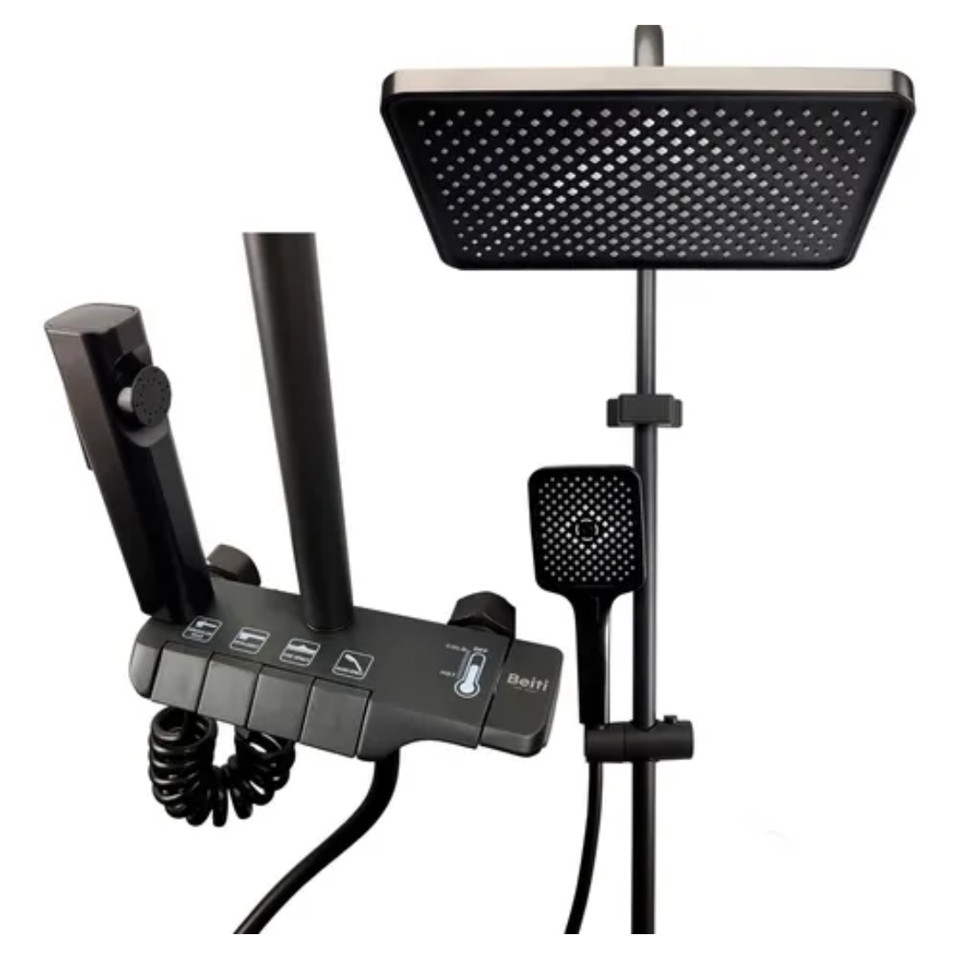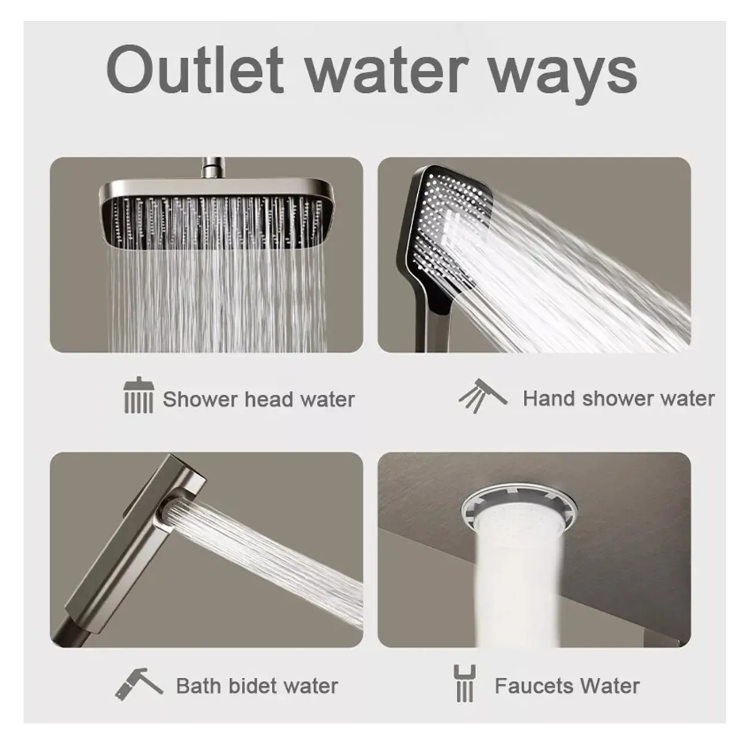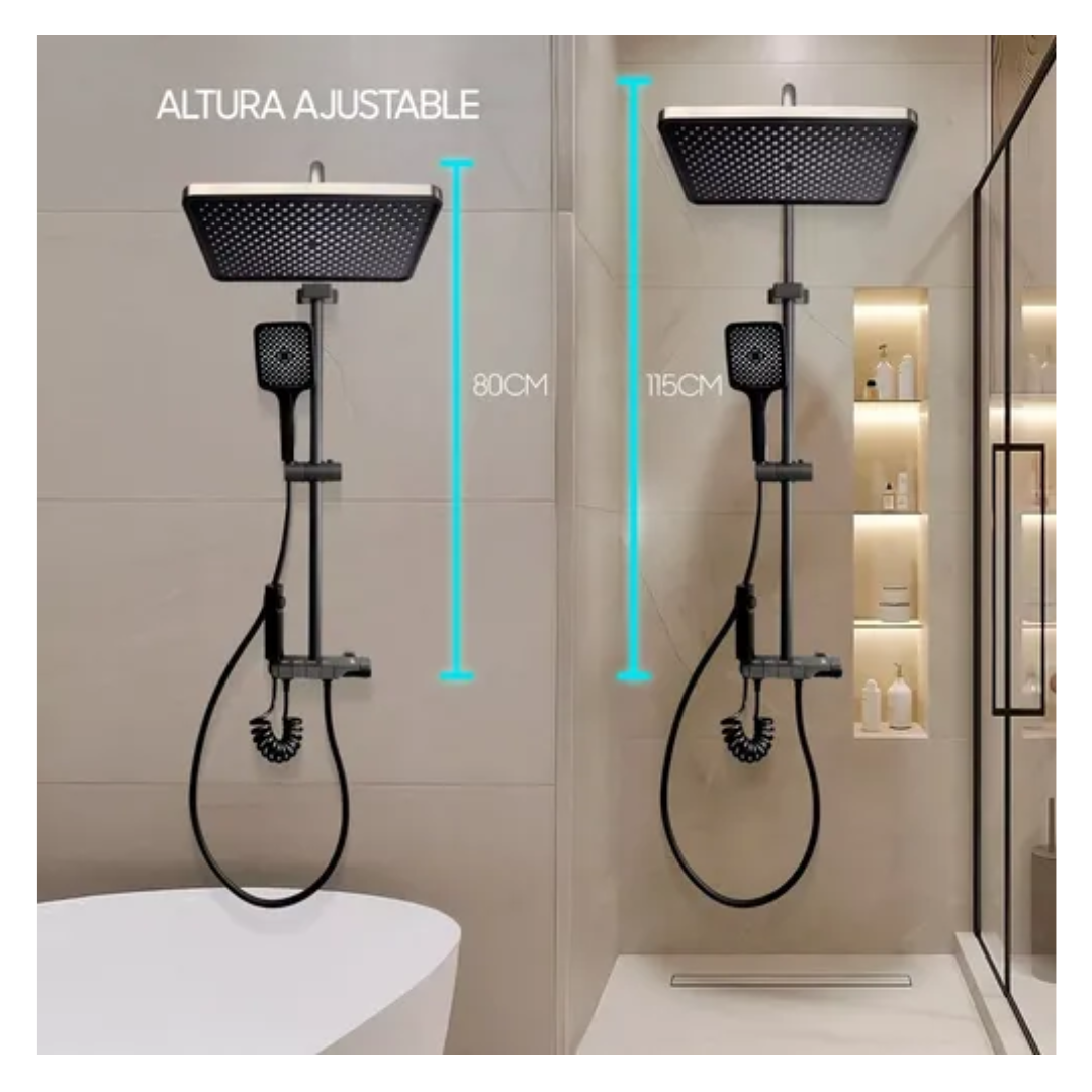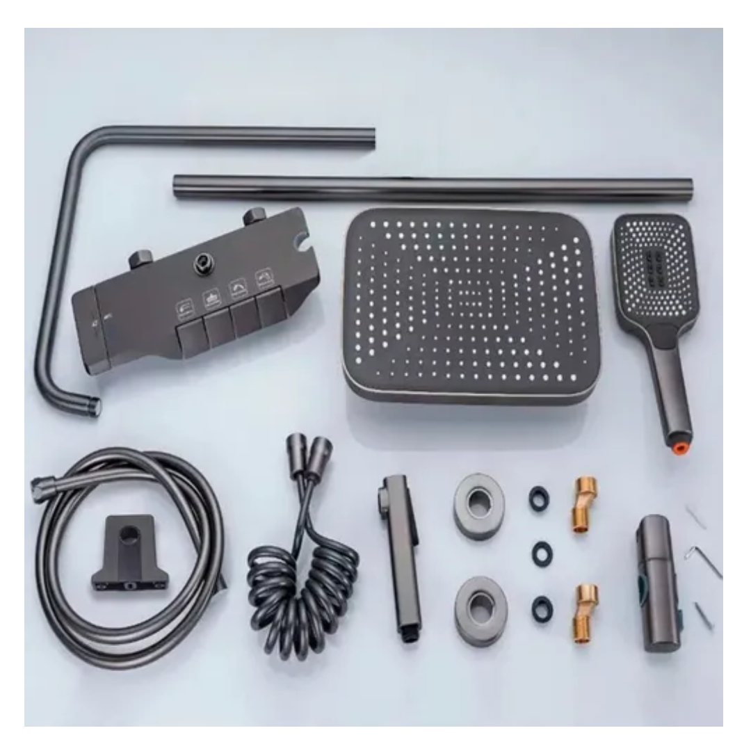 Ducha premium de 4 modos con 3 cabezales, con apertura para agua fria o caliente y un diseño elegante y de lujo, es ideal para todo tipo de duchas, hecho con materiales de alta calidad para mayor durabilidad, esta ducha resalta de otras debido a su diseño con cuello largo para el cabezal de baño de 12 pulgadas, y sus ducha de mano y bidet con 4 modos de uso que se pueden controlar con el panel de 4 botones y ademas en el mismo panel en el lateral cuenta con soporte para bidet y regulador de temperatura.