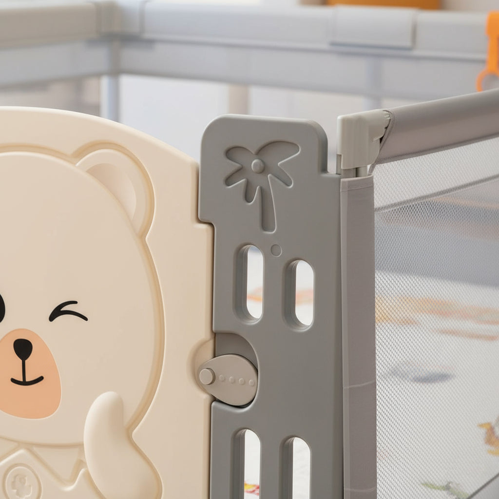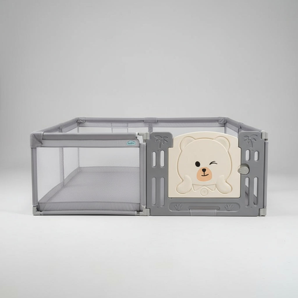 El Corral Infantil Nubo, Puerta de Oso Malla Translúcida es la elección perfecta para los pequeños aventureros de tu hogar. Con un diseño moderno en color gris y confeccionado en resistente tela oxford, este corralito combina funcionalidad y estilo. Su tamaño amplio de 1.8 m de profundidad y 2 m de ancho permite que los niños jueguen cómodamente y exploren su entorno de forma segura.
