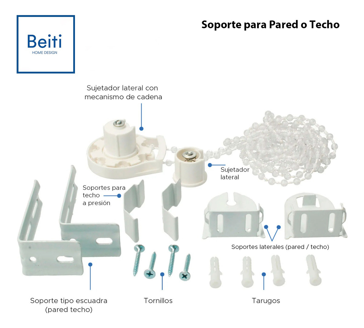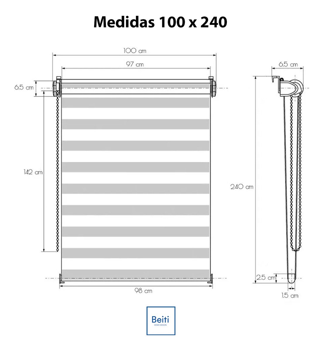 Con sus generosas medidas de 100 cm de ancho por 240 cm de alto, esta cortina es ideal para ventanas amplias o puertas corredizas. Su mecanismo de cadena garantiza un funcionamiento suave, silencioso y duradero, mientras que el sistema de instalación versátil te permite montarla tanto en pared como en techo según tus necesidades específicas.