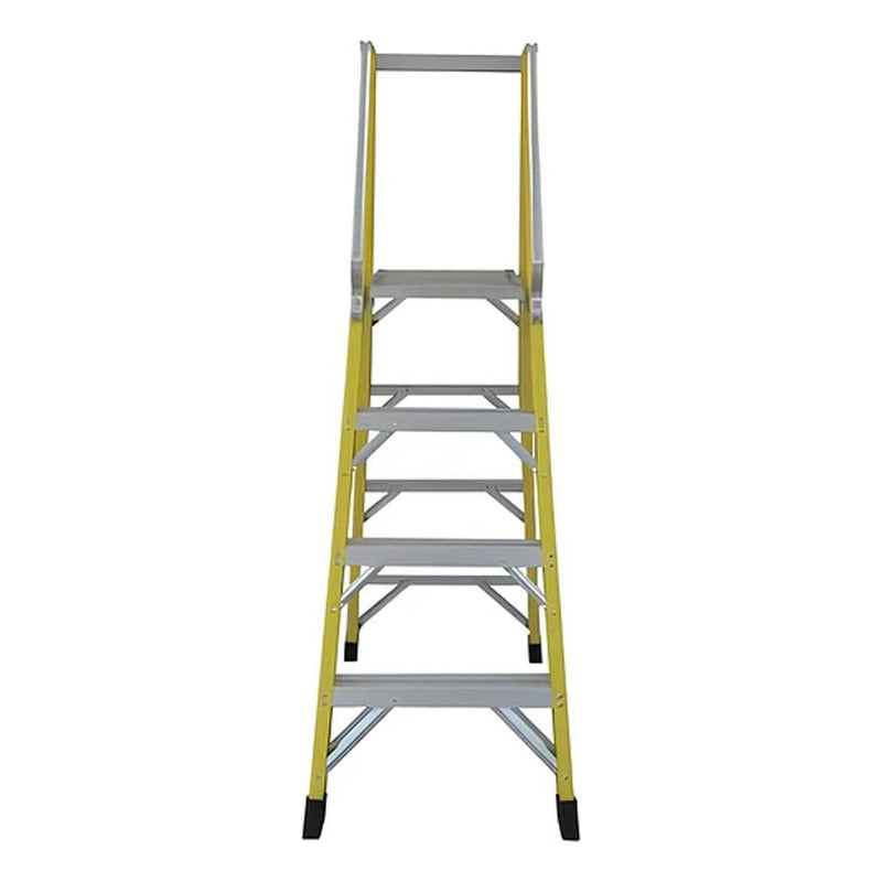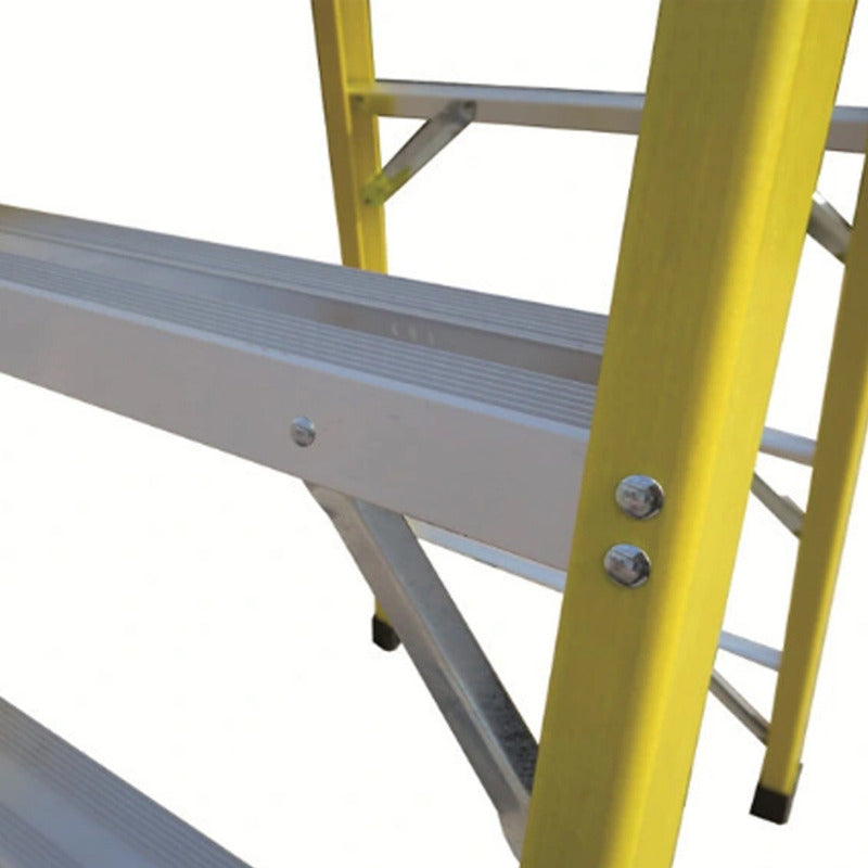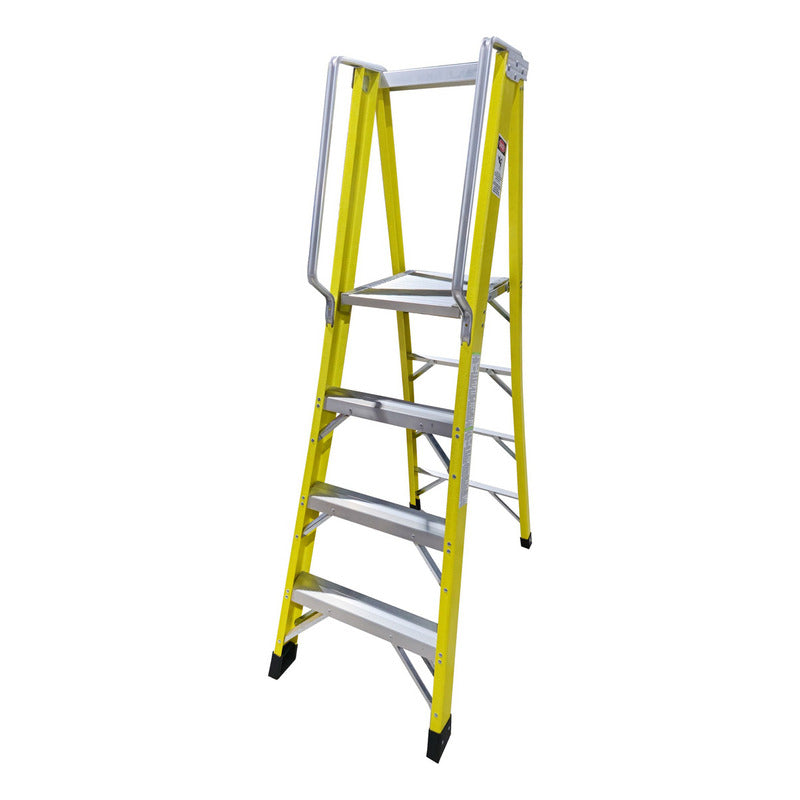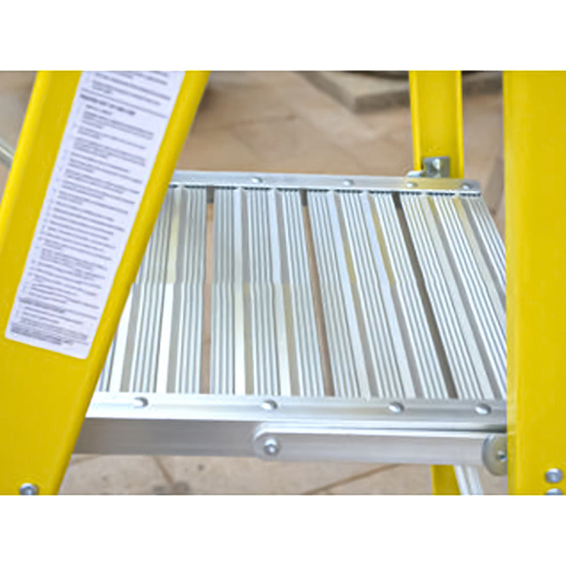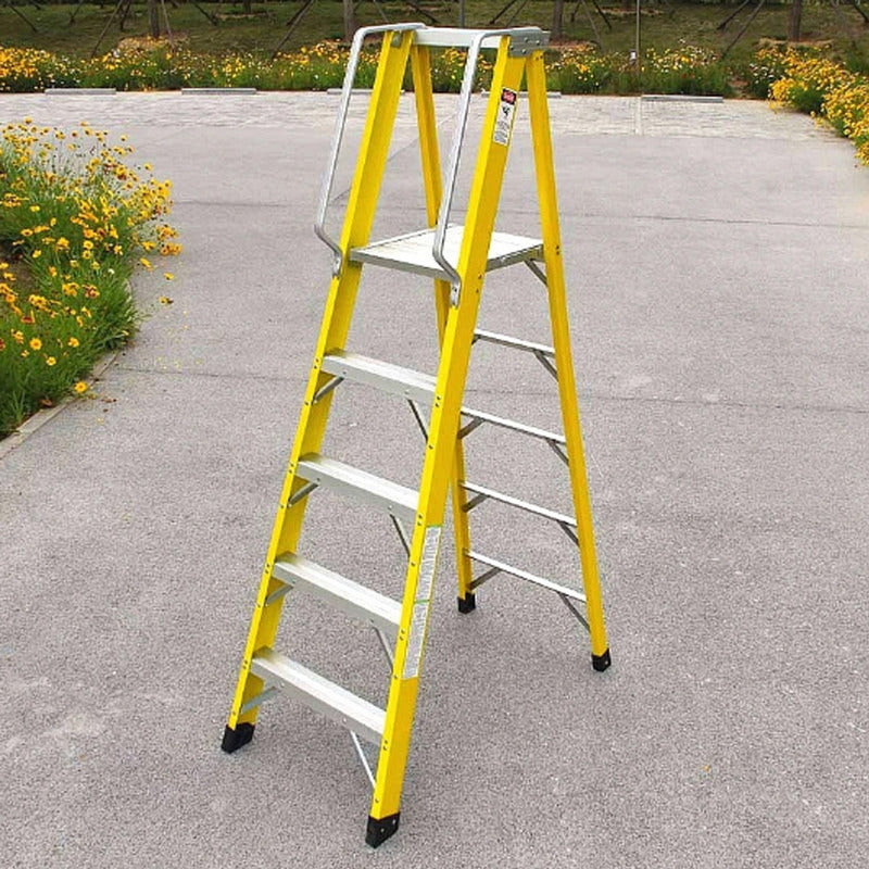 Escalera de 4 Escalones, con una estructura fabricada de fibra de vidrio de la mas alta calidad y peldaños resistentes de Aluminio que soportan hasta 150kg de peso, con una plataforma cuadrada para colocar ya sea herramientas, pinturas u otras cosas, promete ser una herramienta ideal para trabajos de altura ya sea para electricidad, cambiar focos, realizar murales, etc.