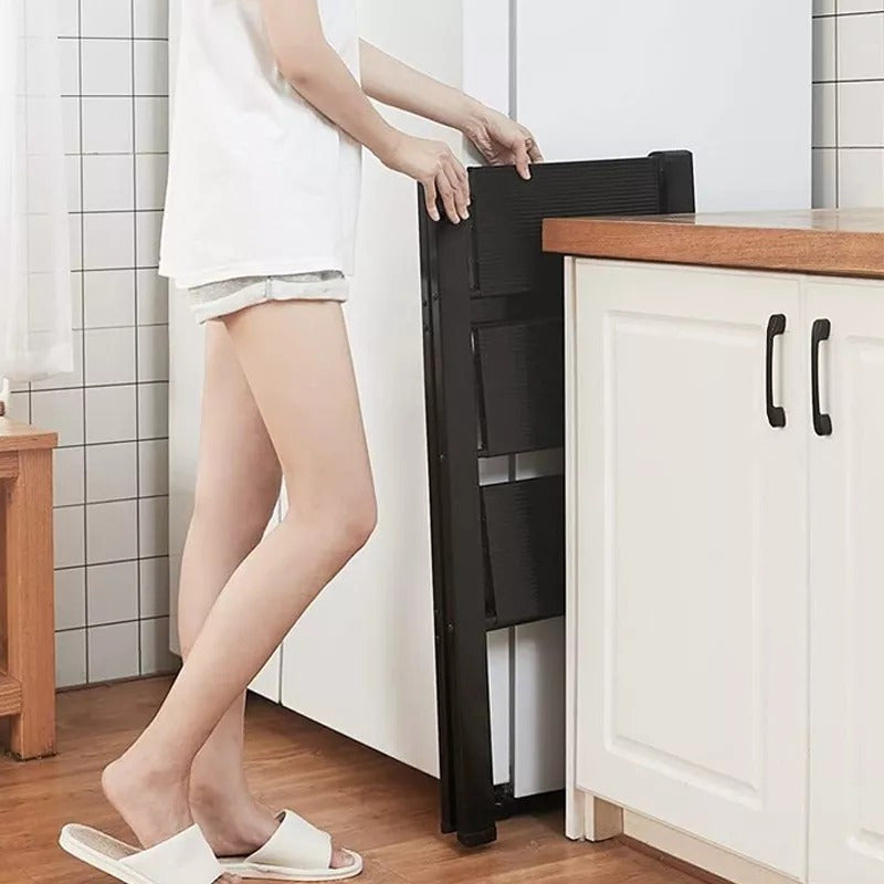 Pies de apoyo antideslizantes: las partes inferiores de los 4 pies están hechas de materiales TPR suaves, lo que hace que esta escalera ligera sea más estable. No solo se puede utilizar como una escalera, sino también como un organizador de estantes bajos.