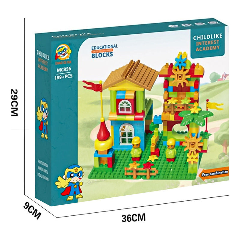 El juego de bloques de construcción es un conjunto diseñado para niños de 3 a 7 años, que contiene más de 189 piezas para construir una casa. Su empaque tiene medidas de 29 cm de alto, 9 cm de ancho y 36 cm de largo. Este juego es de fácil armado y se considera el regalo ideal para fomentar de manera recreativa el aprendizaje de los niños.