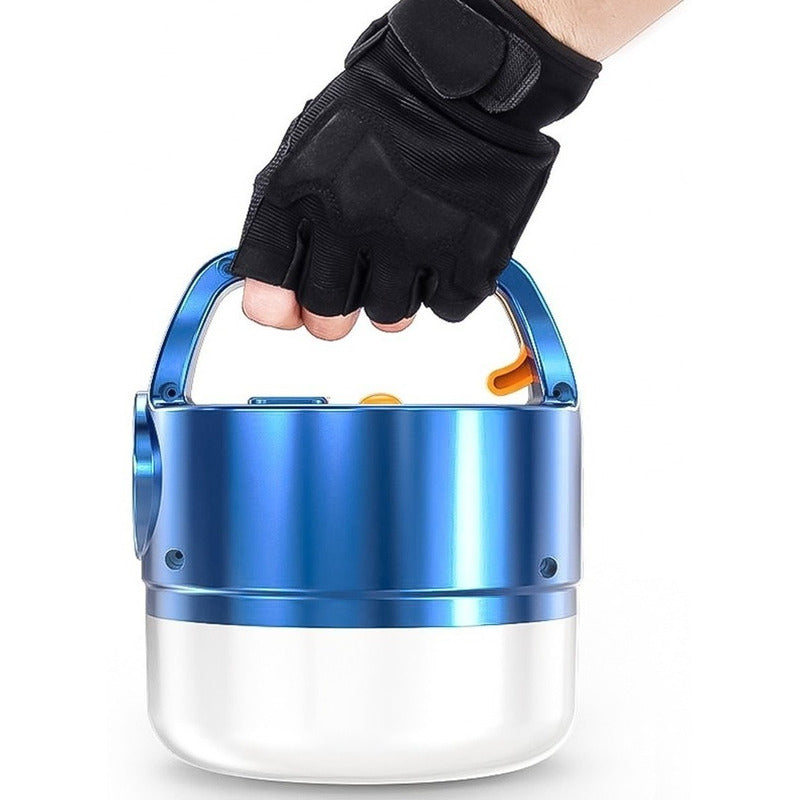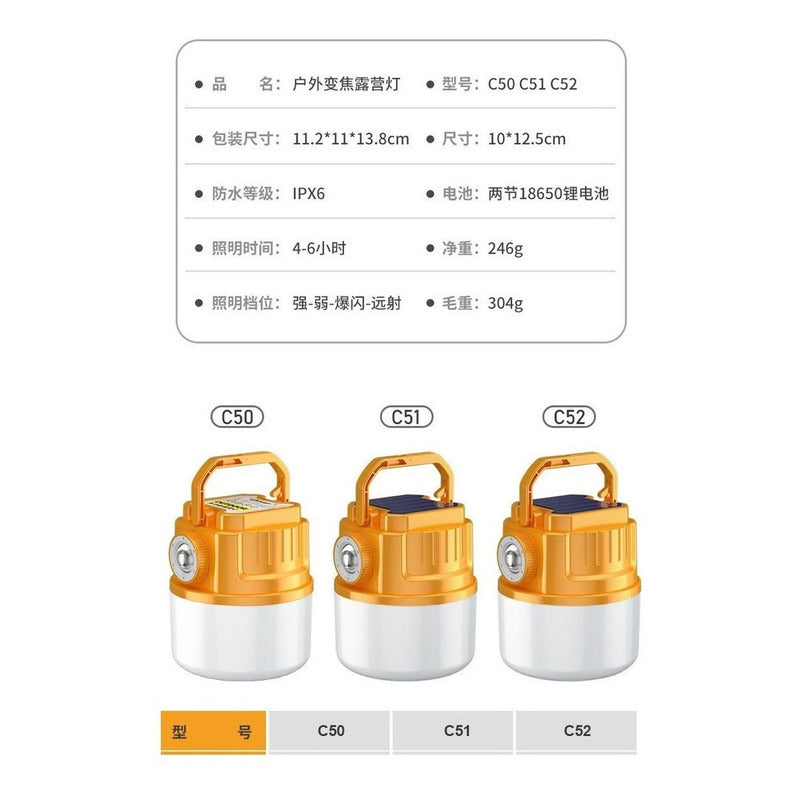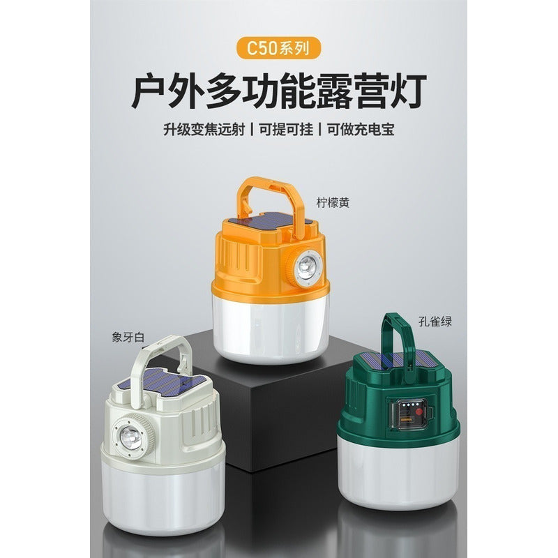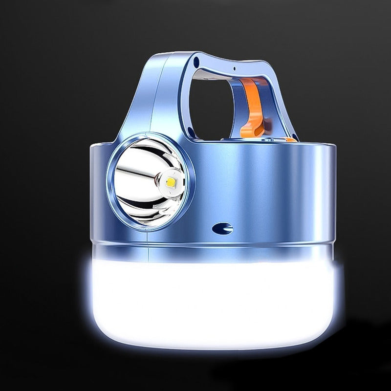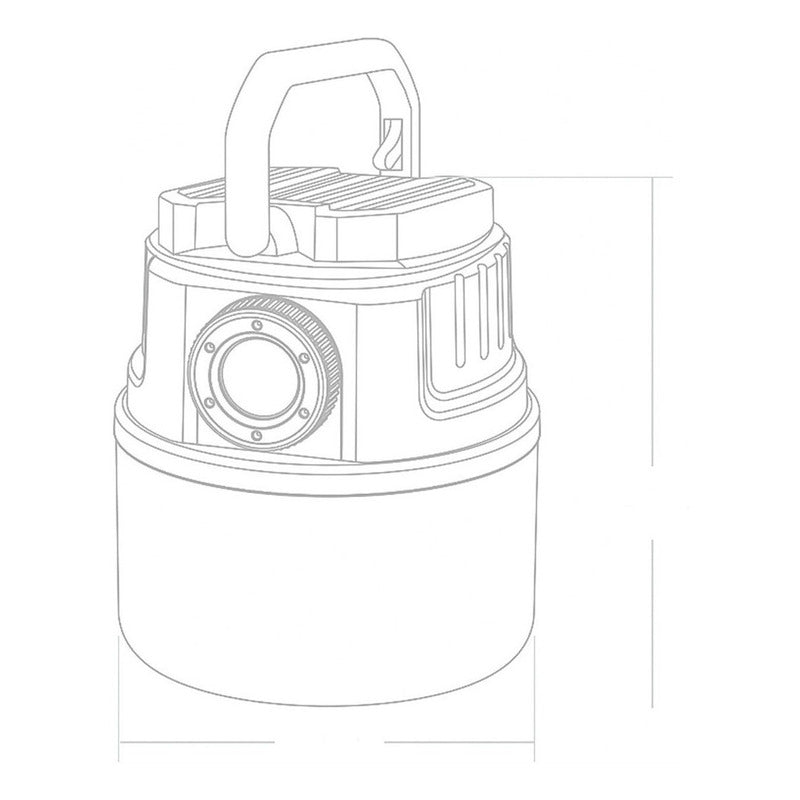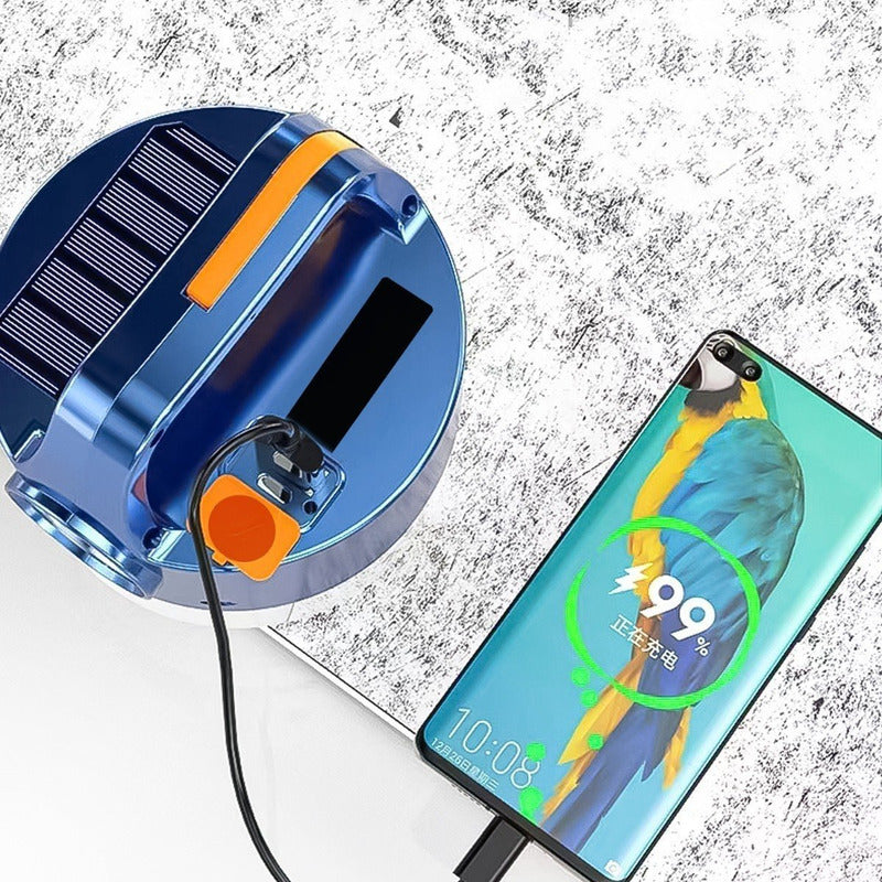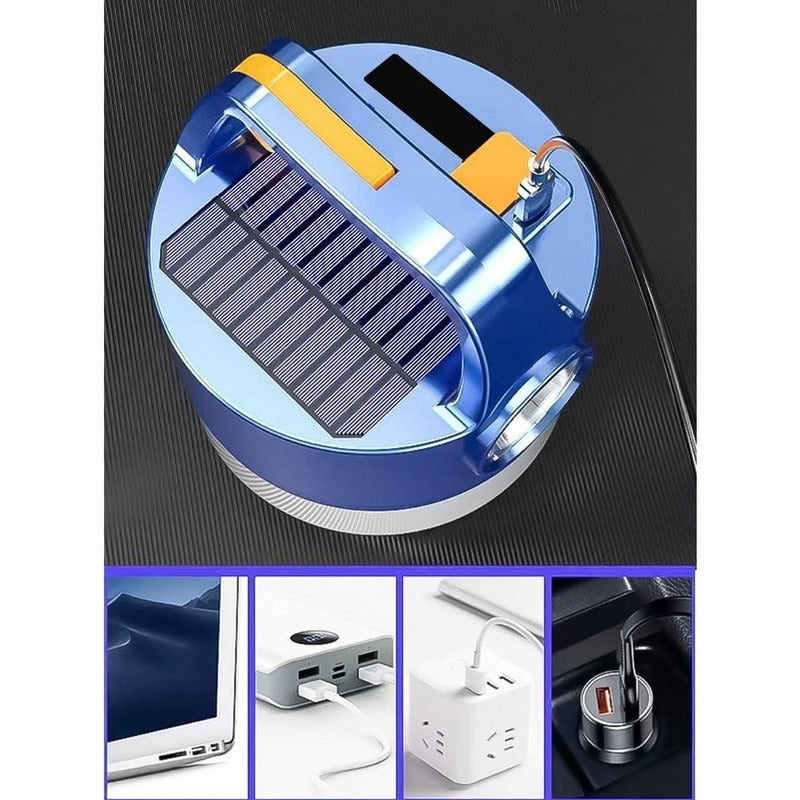 Lampara Camping Solar V8, Esta lampara posee una luz inferior tenue blanca fría, y al costado otro tipo de luz led reflector de luz fría, su fuente de alimentación puede ser por USB o por panel solar, posee además un indicador de carga que te permite saber cuando puedes recargar la lampara, funciona como un powerbank que puede cargar la batería del teléfono.