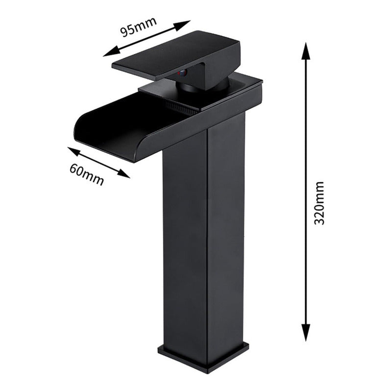 Llave grifo tipo cascada para lavamanos, con 2 mangueras para agua fría o caliente, con un diseño elegante y de lujo, es ideal para todo tipo de lavamanos, hecho con materiales de alta calidad para mayor durabilidad, este grifo resalta de otros debido a su peculiar diseño cuadrado y su boquilla con pliegue cuadrado por la cual al salir el agua simula una cascada.