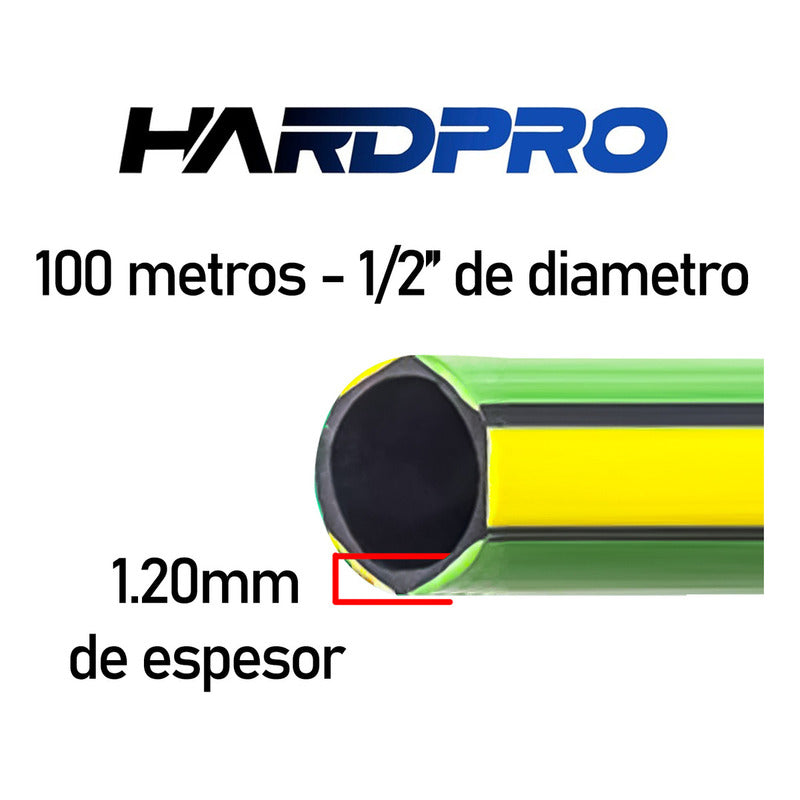 Descripción Hardpro, la cual te permite mantener todas tus siembras y el jardín de tu hogar en su estado mas optimo, la particularidad o lo que diferencia esta manguera de las demás es que tiene un recubrimiento de Protección UV y un material de PVC de alta calidad con un espesor de 1.2mm, el cual evita que esta se enrede o corte la presión del agua, en cuanto a la presión del agua, esta manguera soporta hasta 2300 psi. Esta manguera de riego te asegura, protección contra rayos UV, Materiales de primera calidad, especial para exteriores, mas resistencia y durabilidad que otras mangueras de riego convencionales.