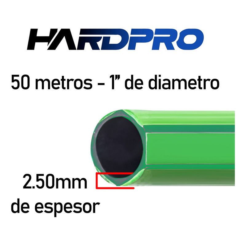 Descripción Manguera de Riego de alta calidad verde de la marca Hardpro, la cual te permite mantener todas tus siembras y el jardín de tu hogar en su estado mas optimo, la particularidad o lo que diferencia esta manguera de las demás es que tiene un recubrimiento de Protección UV y un material de PVC de alta calidad con un espesor de 2.5mm, el cual evita que esta se enrede o corte la presión del agua, en cuanto a la presión del agua, esta manguera soporta hasta 2300 psi.