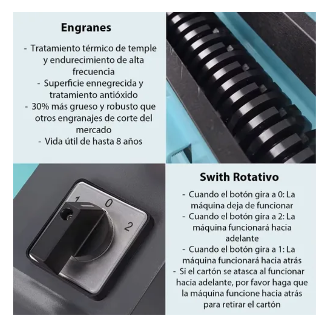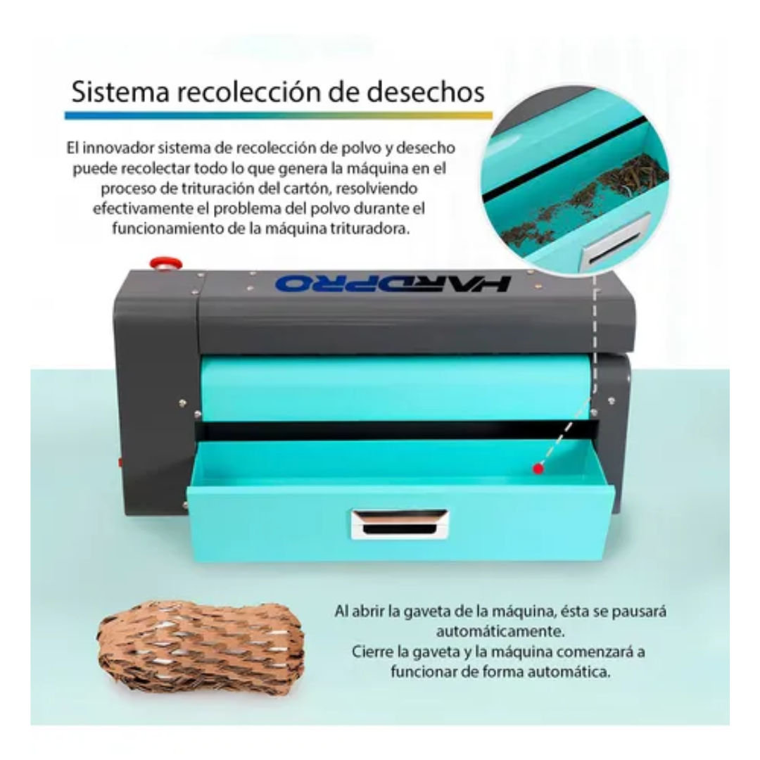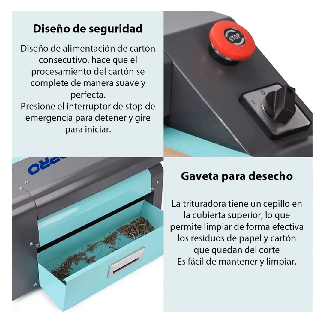 La trituradora asegura un funcionamiento suave y consistente que minimiza interrupciones y reduce costos de mantenimiento. Su sistema de seguridad inteligente detiene automáticamente la operación cuando se abre el cajón, protegiendo al usuario y previniendo accidentes. Con capacidad para manejar cartón corrugado de hasta 350mm de ancho, la máquina corta automáticamente cualquier material que exceda esta medida, asegurando un procesamiento continuo y eficiente.