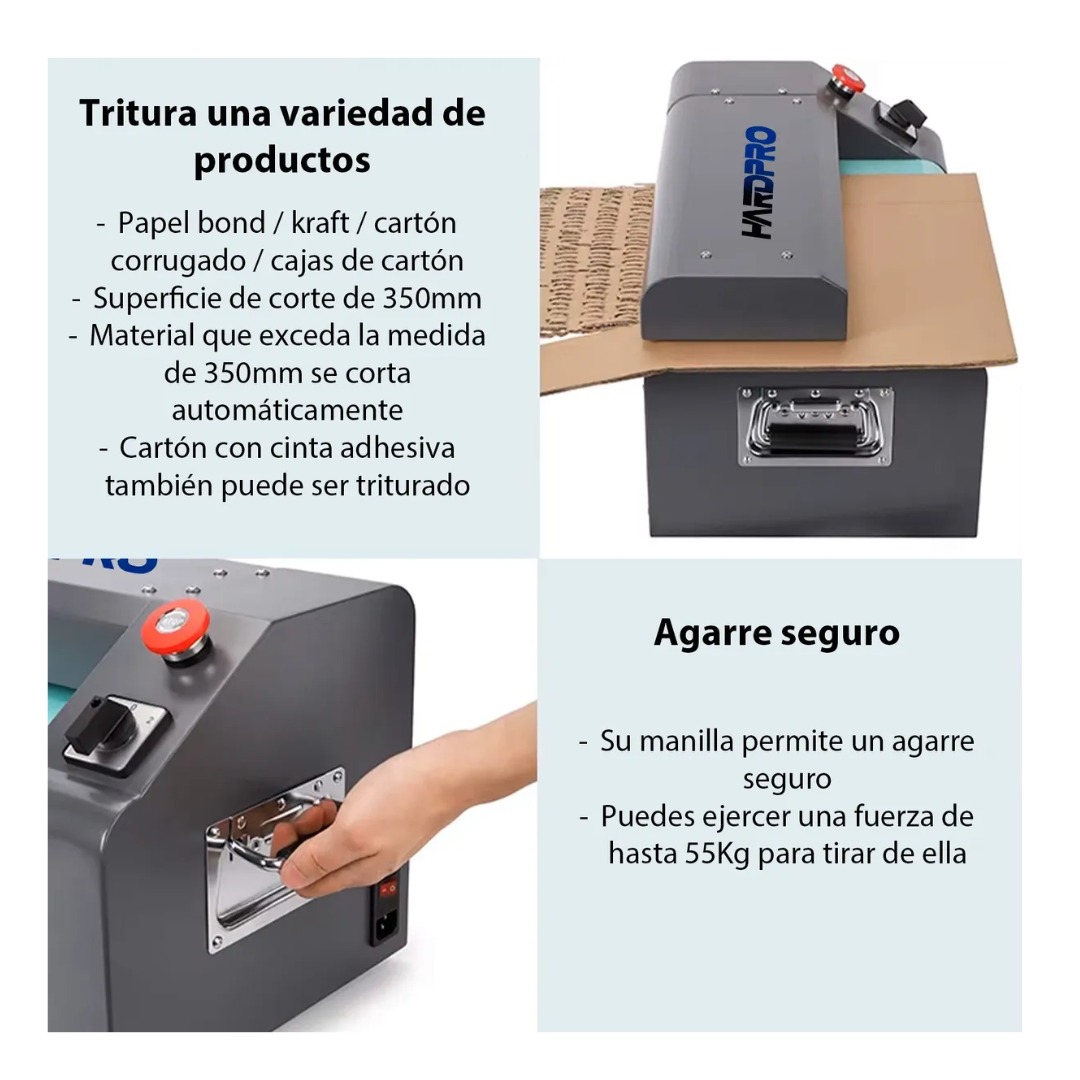 La Trituradora de Cartón HardPro de 350mm representa una revolución en el manejo sostenible de residuos de cartón para oficinas y pequeñas empresas. Esta máquina compacta transforma instantáneamente el cartón de desecho en un valioso material de embalaje y protección, convirtiendo lo que antes era un problema de gestión de residuos en una oportunidad de ahorro económico y compromiso ambiental.
