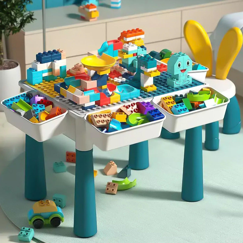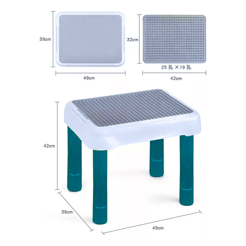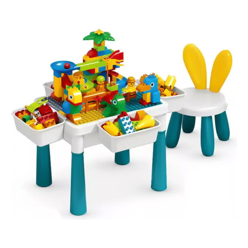 Mesa didáctica para construcciones de bloques y aprendizaje para niños, esta mesa incluye mas de 85 piezas de bloques para armar, pegatinas para los bloques , 1 silla pequeña y una tabla de bloques , al voltear la tabla puede usarse como una mesa para niños para jugar y también incluye 2 envases laterales para colocar los bloques.