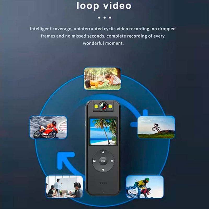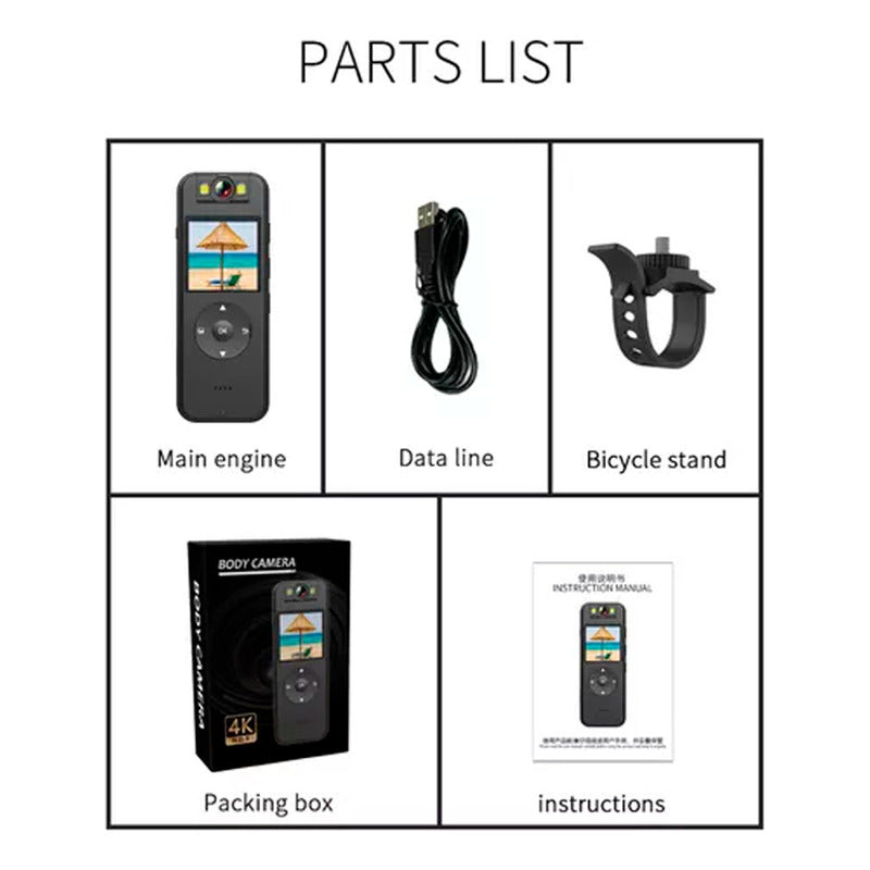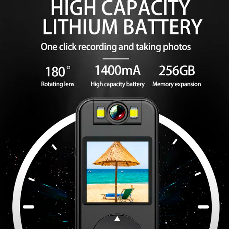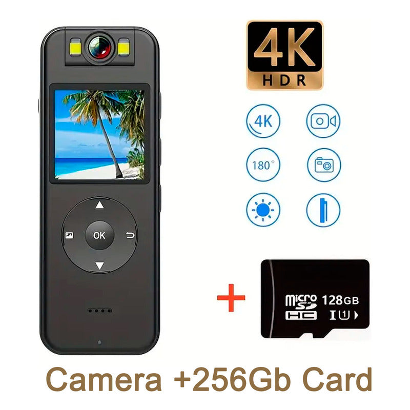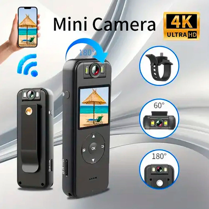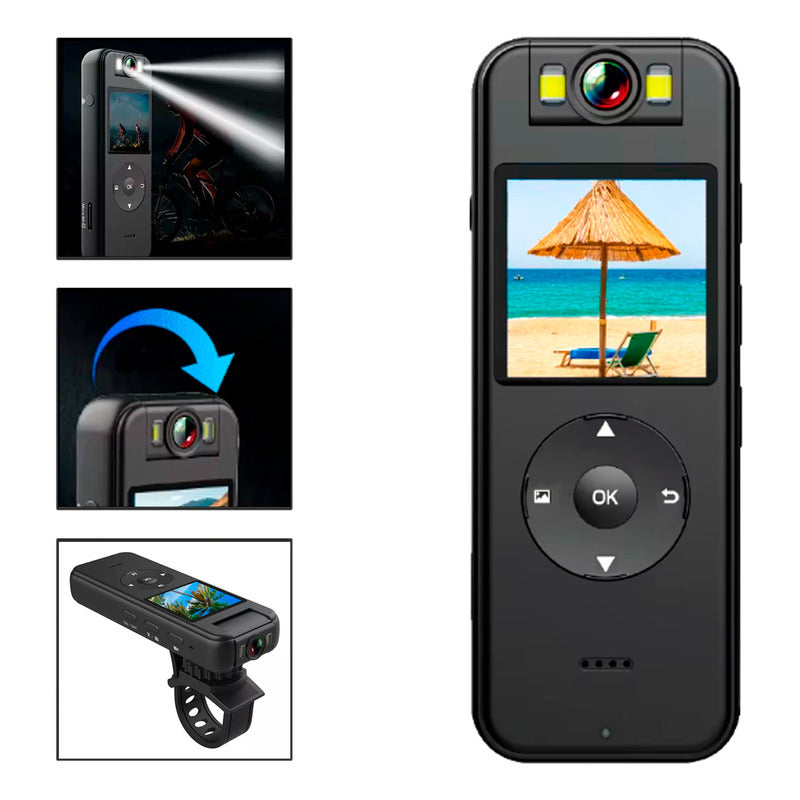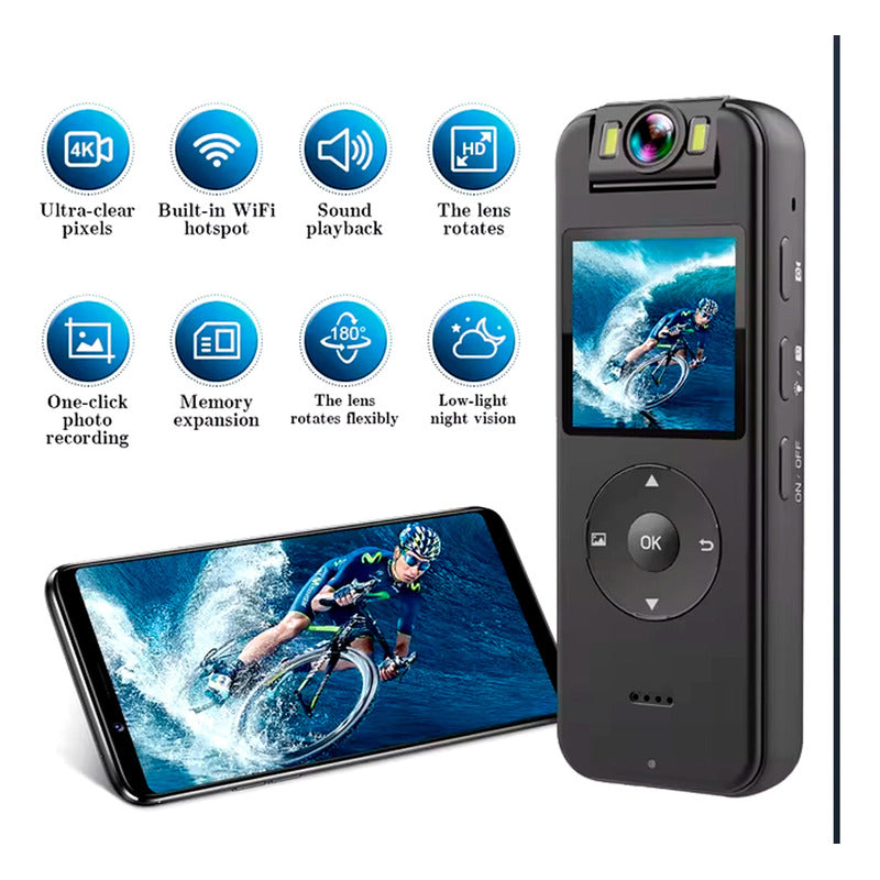 la Cámara Portátil 180 Lente Giratoria 4K, se puede conectar a una aplicación de teléfono móvil dedicada para visualización simultánea. Viene con luz de relleno LED para su comodidad durante la noche. posee lente giratoria ajustable, vista panorámica, La cámara deportiva tiene un botón de video y foto separado, que puede completar con solo hacer clic en situaciones especiales o de emergencia.