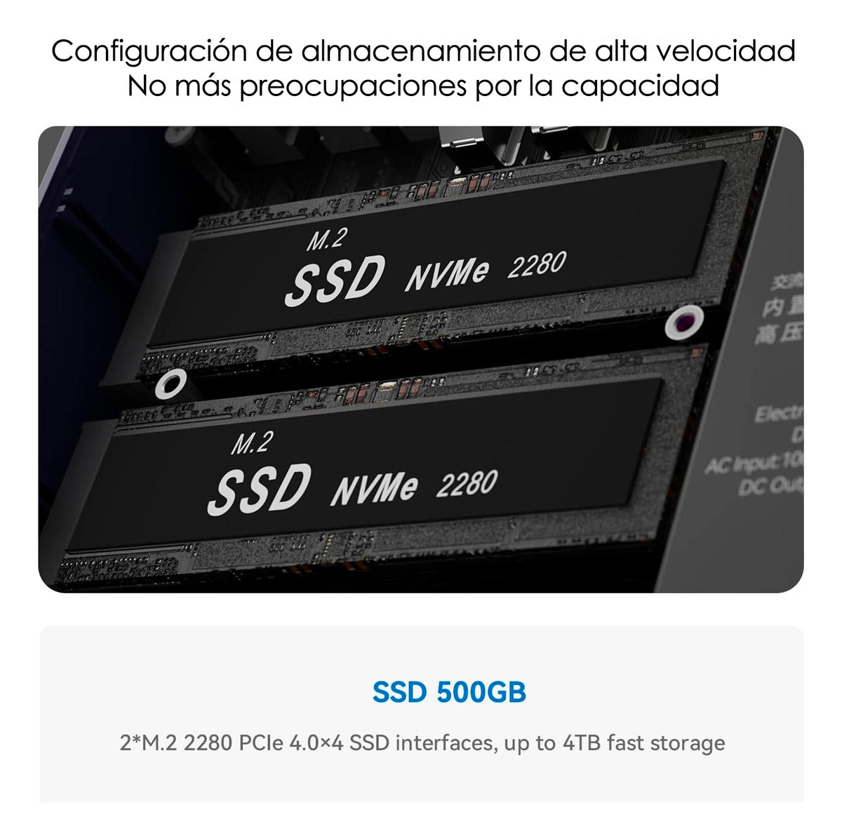 La Mini PC cuenta con un almacenamiento SSD de 500GB en una interfaz PCIe 4.0, lo que asegura una rápida carga de aplicaciones y un acceso eficiente a sus datos. Además, sus 8 núcleos permiten un rendimiento fluido, convirtiéndola en una opción ideal para quienes necesitan una computadora que se adapte a sus necesidades sin complicaciones.
