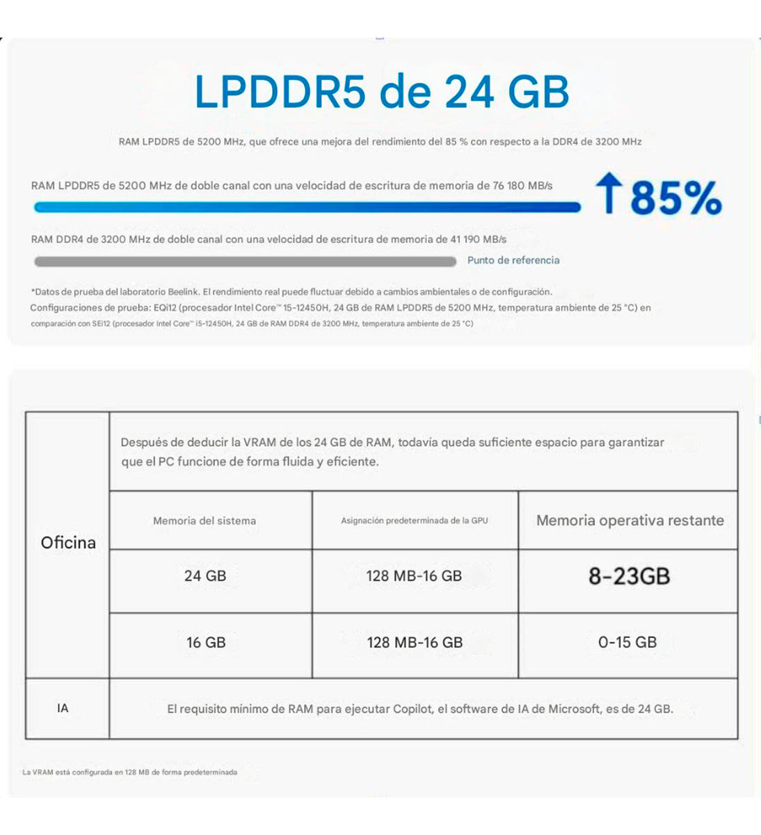 El EQi12 cuenta con 24 GB de RAM Micron LPDDR5 de 5200 MHz de alta capacidad y alta frecuencia, que cumple con los requisitos mínimos de RAM para ejecutar Copilot, el software de inteligencia artificial de Microsoft.