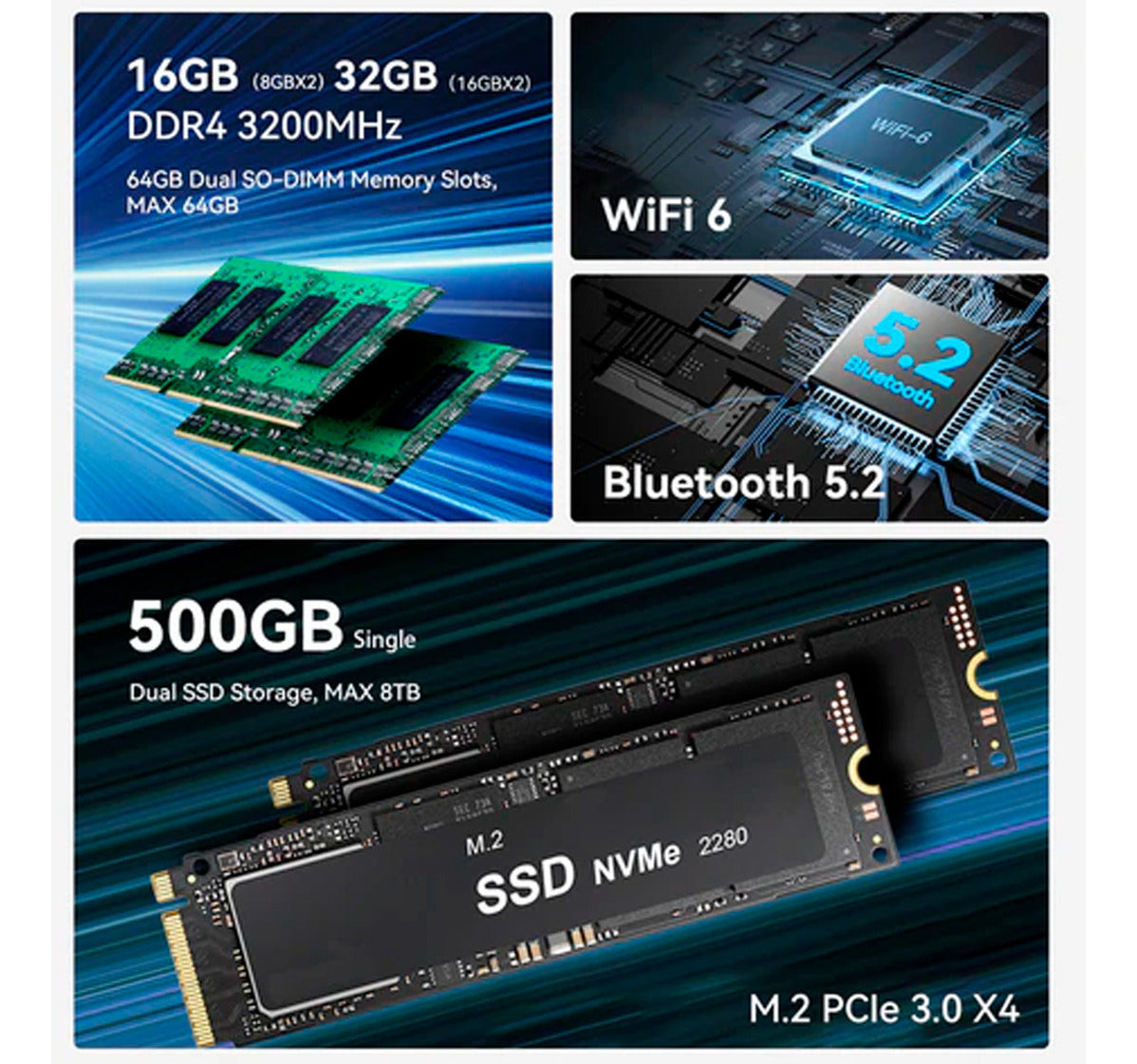 El corazón de este mini PC es su procesador AMD Ryzen™ 7 5825U de 8 núcleos y 16 hilos, diseñado para ejecutar aplicaciones exigentes, editar videos en alta resolución y realizar múltiples tareas con una velocidad y fluidez impresionantes. Con 16GB de RAM DDR4, experimentarás un desempeño veloz y estable, ya sea trabajando en proyectos de oficina complejos, diseño gráfico profesional o gaming ligero. El almacenamiento SSD M.2 de 500GB garantiza que el sistema inicie en segundos y puedas acceder a todos tus archivos al instante.