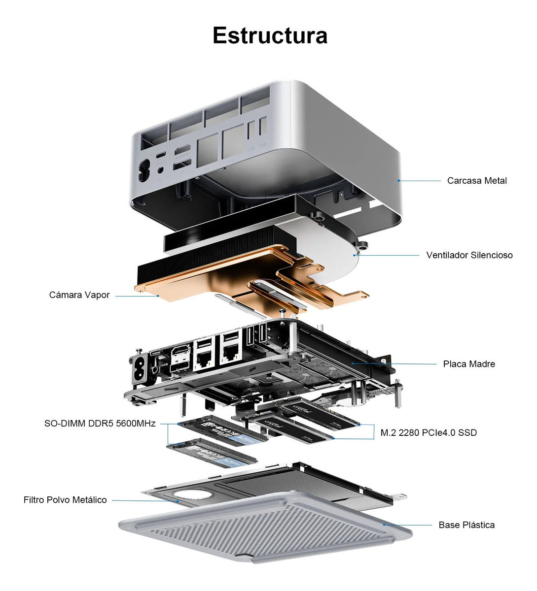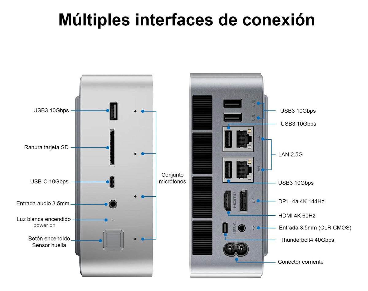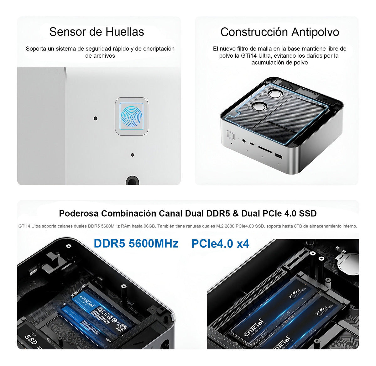 Este Mini PC no conoce límites cuando se trata de expansibilidad. Soporta hasta 96GB de RAM DDR5 de doble canal a 5600MHz, garantizando un rendimiento fluido incluso en las tareas más exigentes. Con dos ranuras M.2 2280 PCIe 4.0, puede albergar hasta 8TB de almacenamiento interno ultrarrápido. Además, su interfaz PCIe 5.0 x8 permite conectar tarjetas gráficas externas (no incluidas), multiplicando exponencialmente la capacidad de procesamiento gráfico.