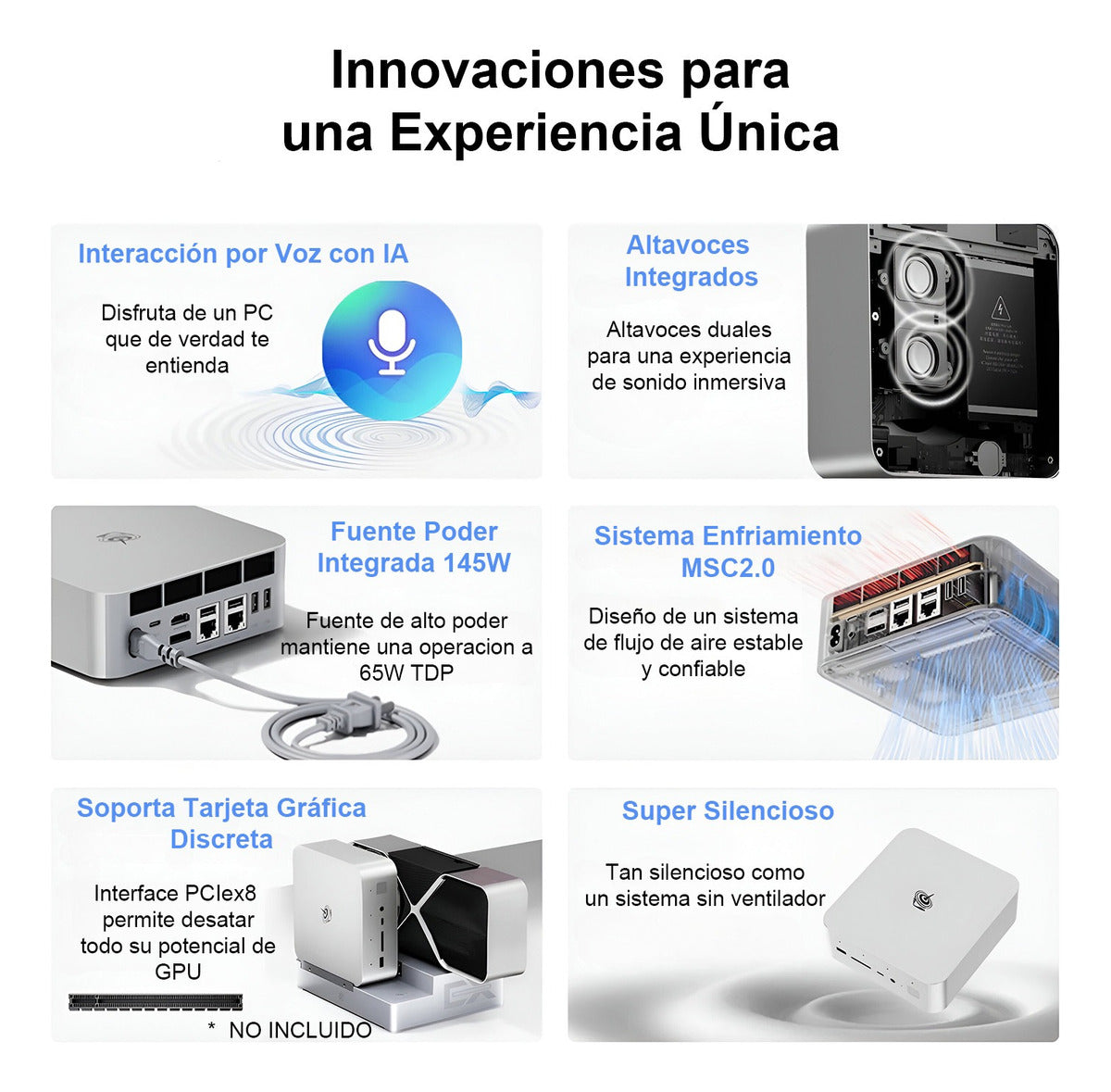 - Se puede conectar a una base con tarjeta gráfica discreta (no incluidas)