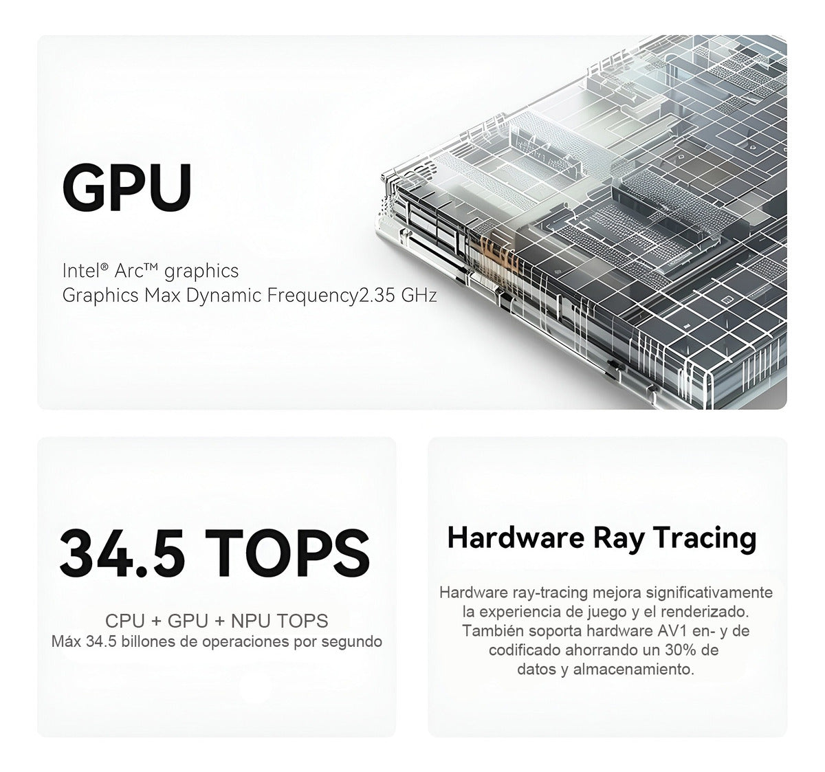 - CPU+GPU+NPU Max 34.5 billones de operaciones por segundo
