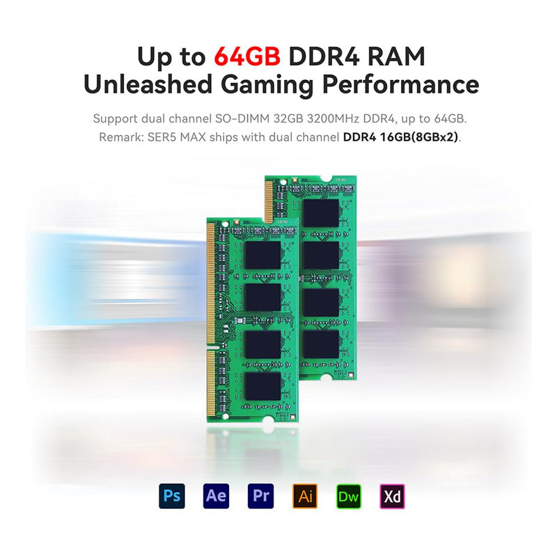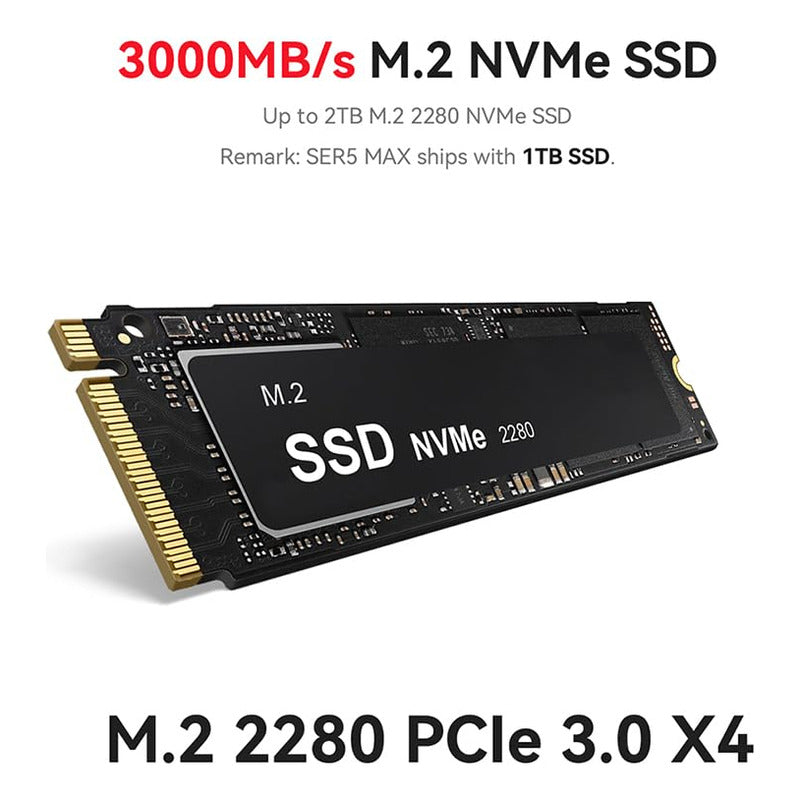 El mini PC Beelink SER5 está impulsado por el potente procesador AMD Ryzen 7 5800H, que cuenta con 8 núcleos y 16 hilos, ofreciendo una frecuencia base de 3.2 GHz y una frecuencia máxima dinámica de 4.4 GHz. Con tecnología de 7 nm y un TDP máximo de 57 W, proporciona un rendimiento excepcional para una variedad de aplicaciones, desde juegos AAA hasta edición de imágenes y programación. Su capacidad para manejar tareas intensivas se complementa con una memoria DDR4 SO-DIMM de 32 GB, expandible hasta 64 GB, y un SSD NVMe de 500 GB, ampliable a 2 TB, garantizando una experiencia de usuario fluida y rápida.