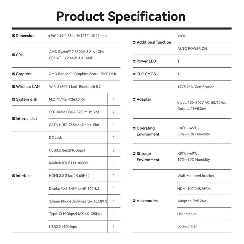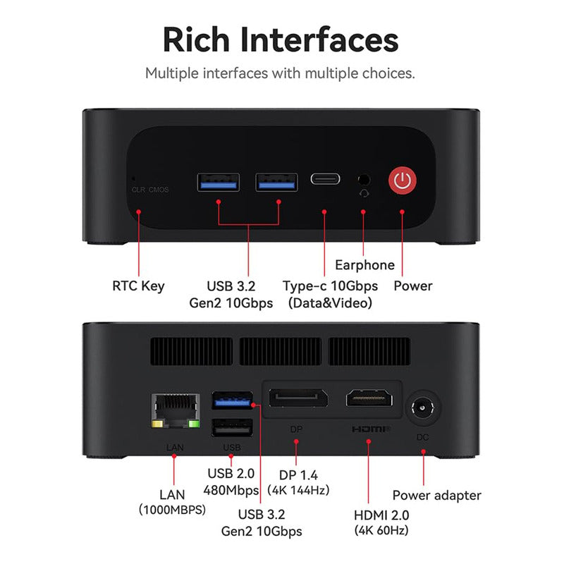 El Beelink SER5 destaca por su capacidad de conectividad y versatilidad. Admite reproducción de vídeo en 4K con gráficos AMD Radeon 8-core y soporta una configuración de pantalla triple a 60 Hz mediante HDMI, DP y USB-C. Además, cuenta con una variedad de interfaces, incluyendo puertos USB 3.2, USB-C, y un conector de audio. La conectividad inalámbrica es robusta con WiFi 6 y Bluetooth 5.2. Incluye soporte VESA para montaje y una serie de accesorios como cables HDMI y adaptador de corriente. Con certificaciones CE, FCC y RoHS, y soporte técnico 24/7, el Beelink SER5 es una solución versátil y fiable para cualquier entorno.