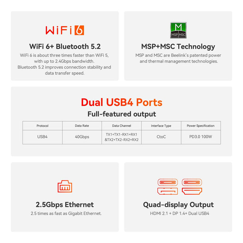 El Beelink SER7 no solo destaca por su rendimiento, sino también por su capacidad de refrigeración avanzada y conectividad versátil. Utiliza un sistema de refrigeración con tubo de cobre y ventilador de alta especificación para mantener la temperatura de la CPU bajo control sin comprometer el rendimiento. Su amplia gama de interfaces incluye puertos USB 3.2, USB 2.0, LAN de 2.5G, HDMI 2.1, DP, y varios tipos de conectores USB-C. Además, soporta una expansión de RAM de hasta 64 GB y almacenamiento de hasta 2 TB, ofreciendo flexibilidad para diferentes necesidades. Con conectividad WiFi 6 y Bluetooth 5.2, y un servicio postventa de 3 años con soporte técnico 24/7, el SER7 es una opción robusta y fiable para usuarios exigentes.