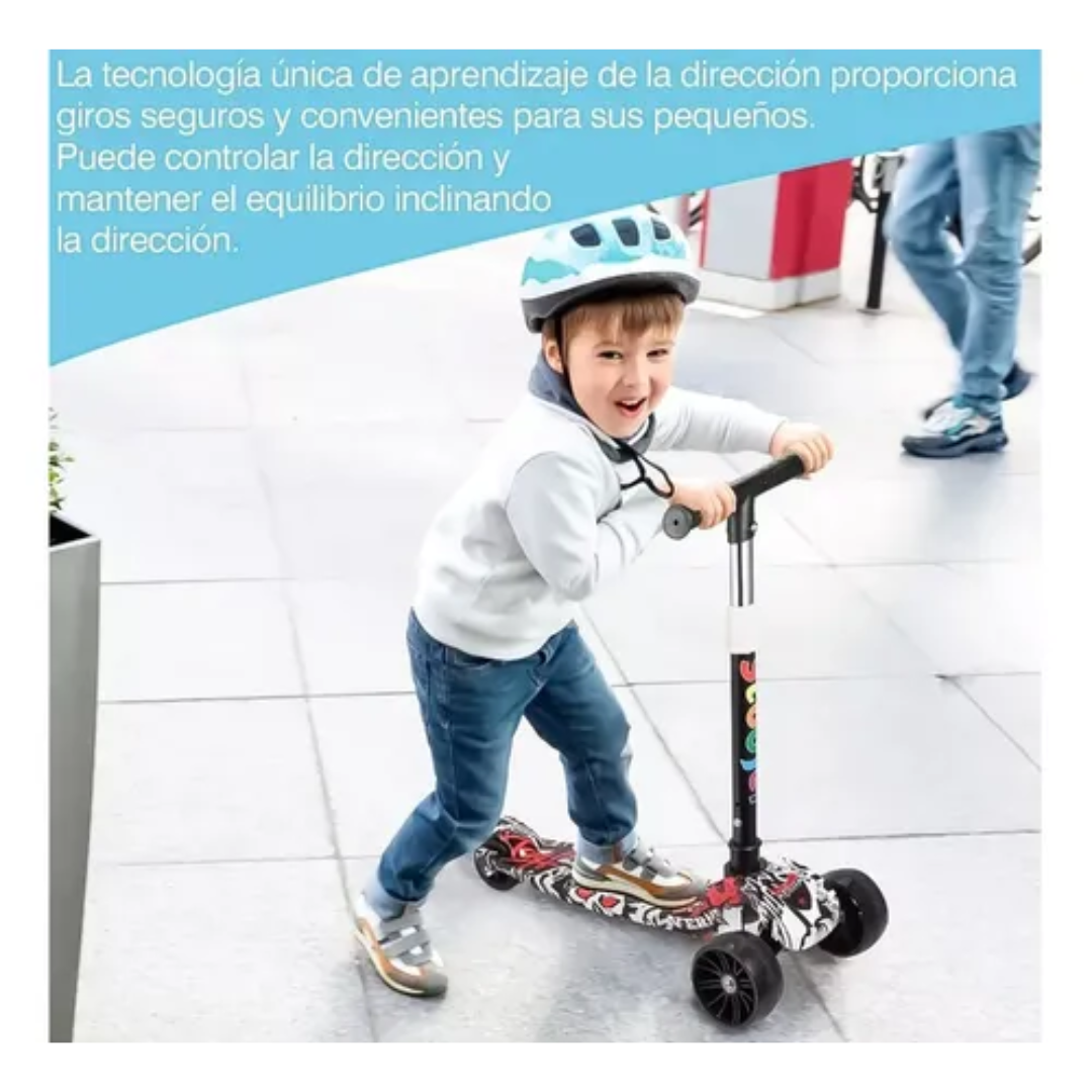 Cuenta con 3 ruedas para mayor estabilidad y control, lo que permite que los niños viajen con confianza y seguridad, manubrio plástico de alta calidad, seguro y diseñado especialmente para niños, ruedas de poliuretano con rodamientos LED, que le da luminosidad al girar, también crean un deslizamiento muy suave y un paseo tranquilo, la superficie del scooter es baja al suelo y lo suficientemente grande para los dos pies , por lo que es fácil para los niños el subir, bajar y darse impulso para avanzar, el hecho de que su peso sea ligero, hace que sea fácil para los padres o los niños recoger y transportar el monopatin, el scooter es apto para los niños pequeños de 3 años en adelante, además desarrolla sus habilidades de equilibrio, coordinación y motoras, tambien cuenta con una resistente barra de aluminio.