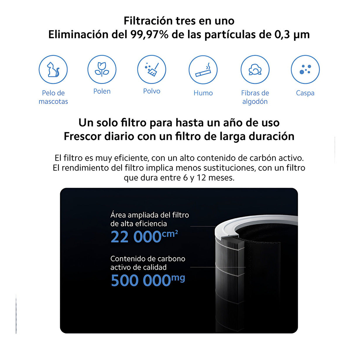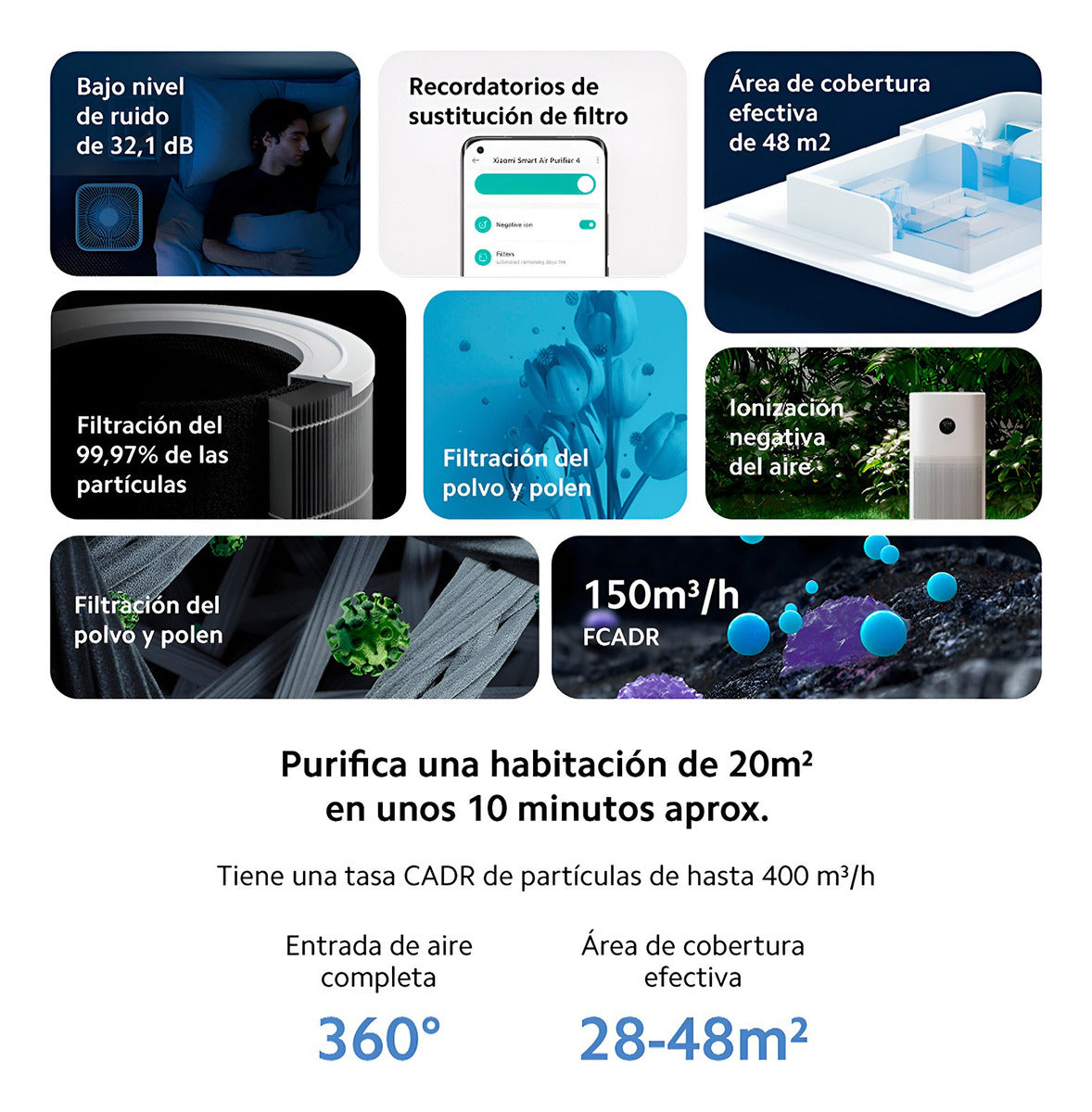 El aire que respiras importa. Por eso, Xiaomi ha creado el Smart Air Purifier 4, un dispositivo diseñado para transformar la calidad del aire en tu hogar u oficina. Con una potente capacidad de purificación de partículas (CADR) de 400 m³/h, este purificador puede renovar completamente el aire de un espacio de 130 m² en tan solo una hora, ofreciéndote un ambiente fresco y saludable sin esperar largas horas.
