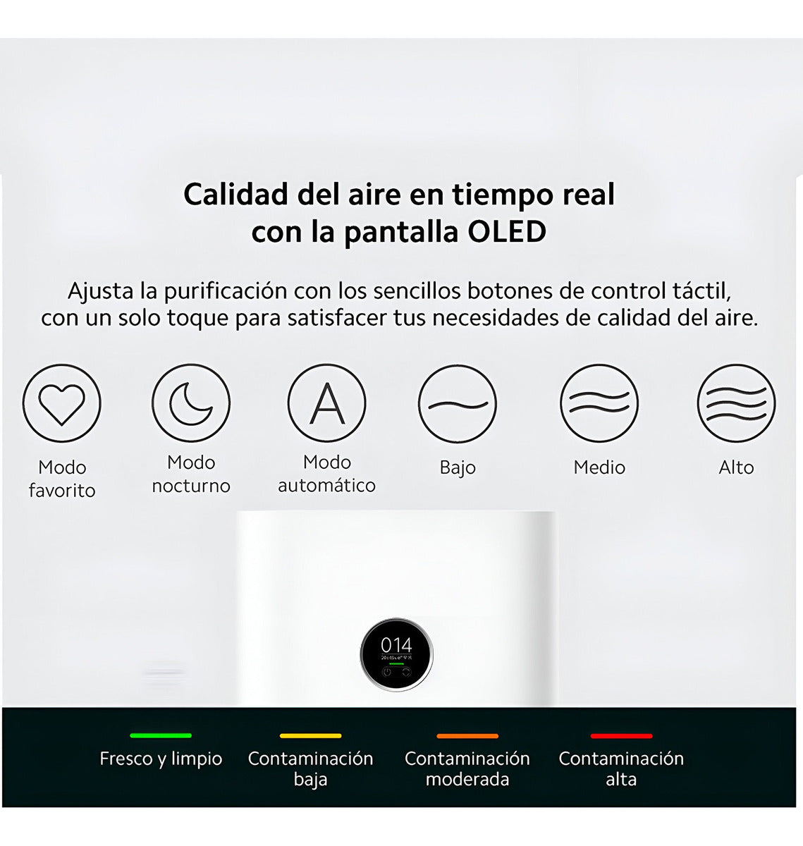 La experiencia de usuario es excepcional gracias a su pantalla táctil OLED, que muestra con gran nitidez el índice de calidad del aire en tiempo real. El sensor de PM 2.5 integrado monitorea constantemente las partículas contaminantes, ajustando automáticamente la potencia de purificación según las necesidades del ambiente.