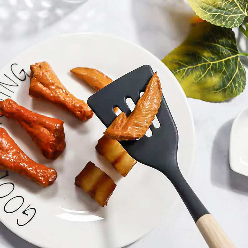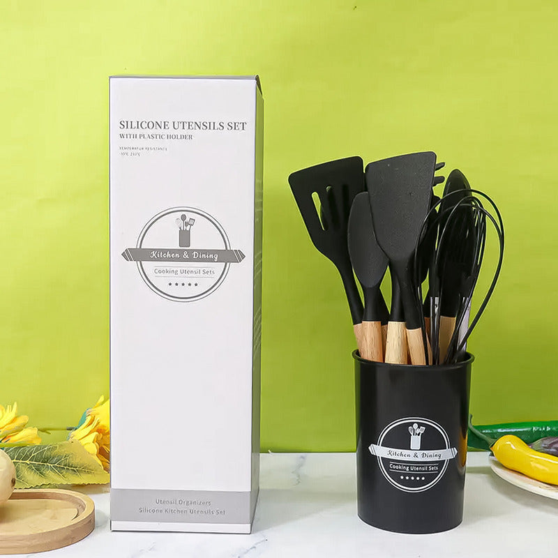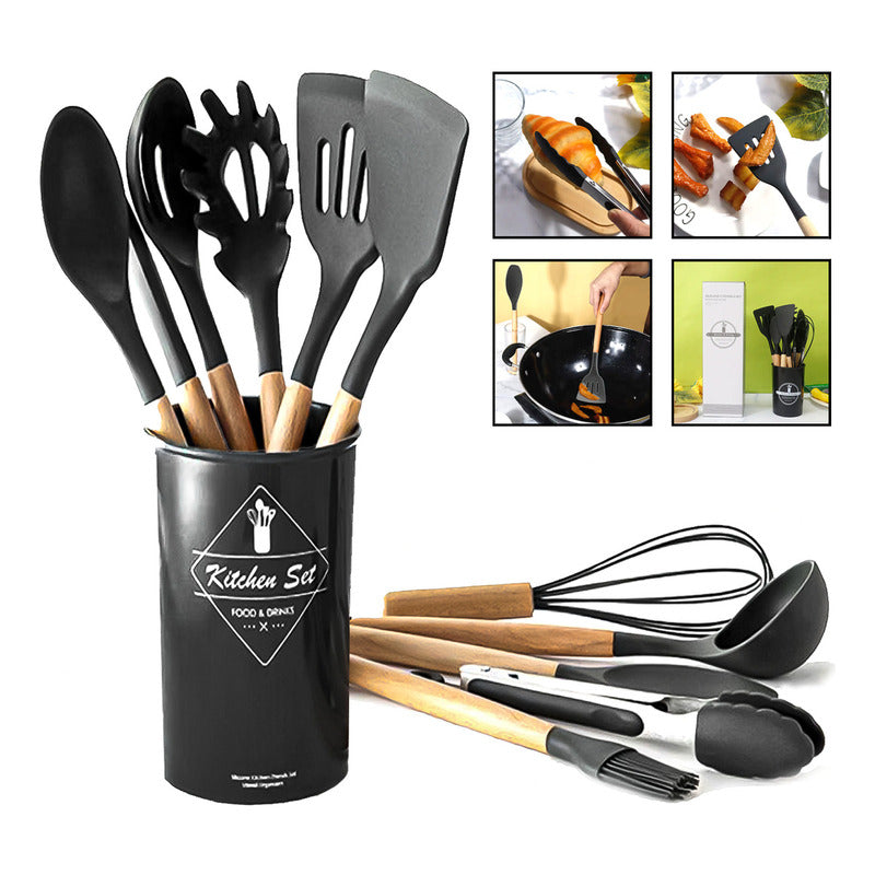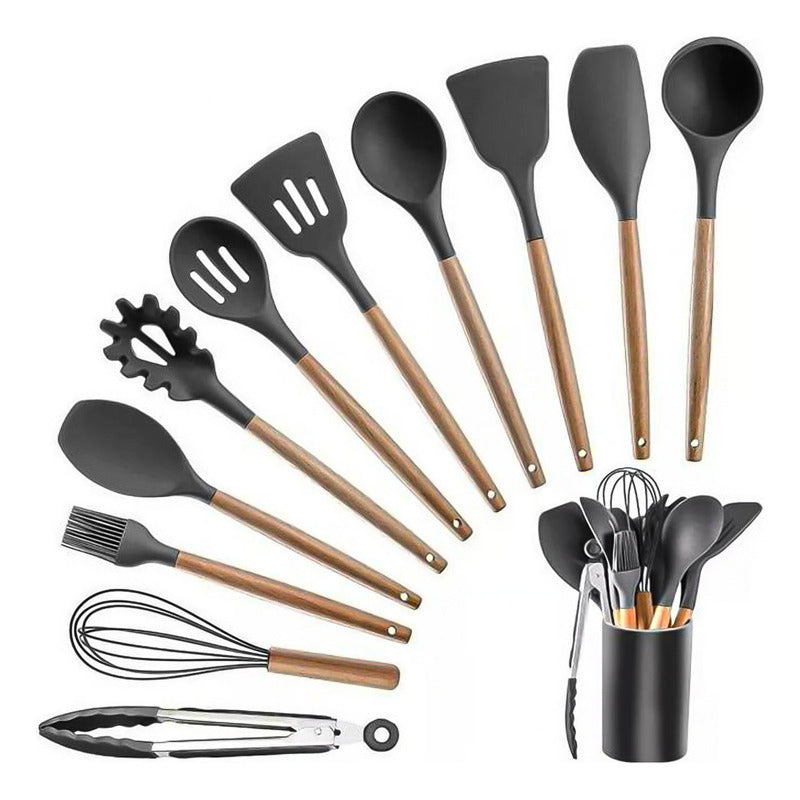 Set 12 Utensilios Cocina Antiadherente Silicona Mango Madera