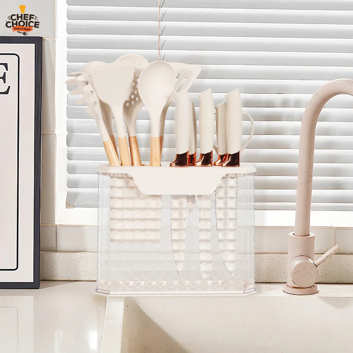 Nuestro juego de cocina incluye un cuchillo cocinero, un cuchillo de pan, un cuchillo para carne, un cuchillo para cocina, un cuchillo para pelar, un servidor de spaghetti, una espátula ranurada, una espátula, un cucharón ranurado, un cucharón, un cuchara, una tijeras y un practico soporte para mantenerlos organizados, cubriendo todas sus necesidades esenciales de cocina con un valor inmejorable.