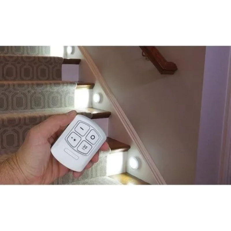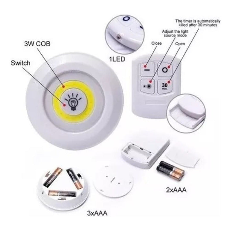 Descripción Set de 3 luces led con control remoto, Ideal para iluminar cualquier espacio, tales como, repisas, gabinetes, closet, baños, cocinas, cuadros, bar, etc. Lleva luz a cualquier espacio donde se hace difícil hacer conexiones eléctricas o bien como luces de emergencia.