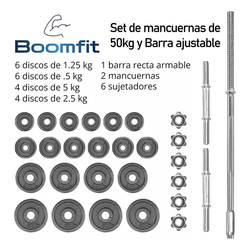 Transforma tu rutina de ejercicios con el Set Mancuernas Gris Oscuro Barra Extendible 50 Kg de Boomfit. Diseñado para quienes buscan un entrenamiento efectivo y versátil, este set es ideal tanto para principiantes como para atletas experimentados. Su construcción en hierro gris garantiza durabilidad y resistencia, permitiéndote realizar una amplia variedad de ejercicios en la comodidad de tu hogar.