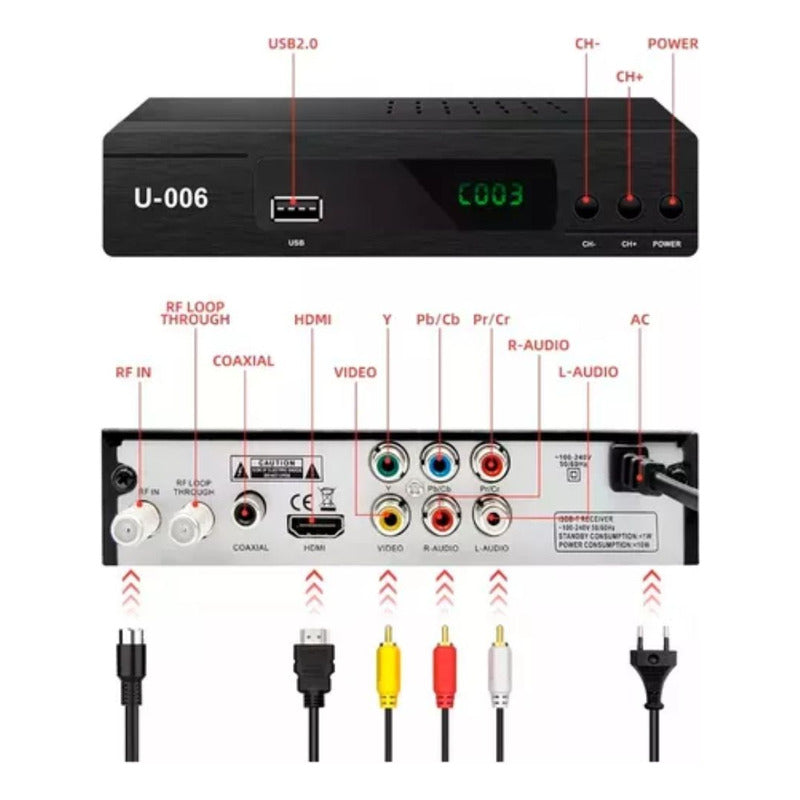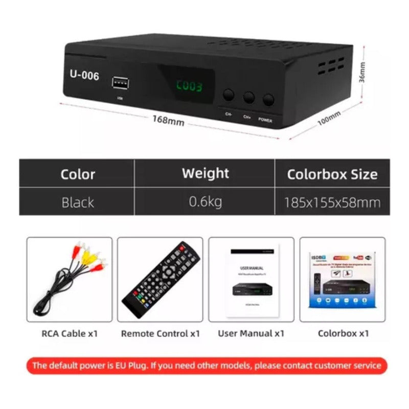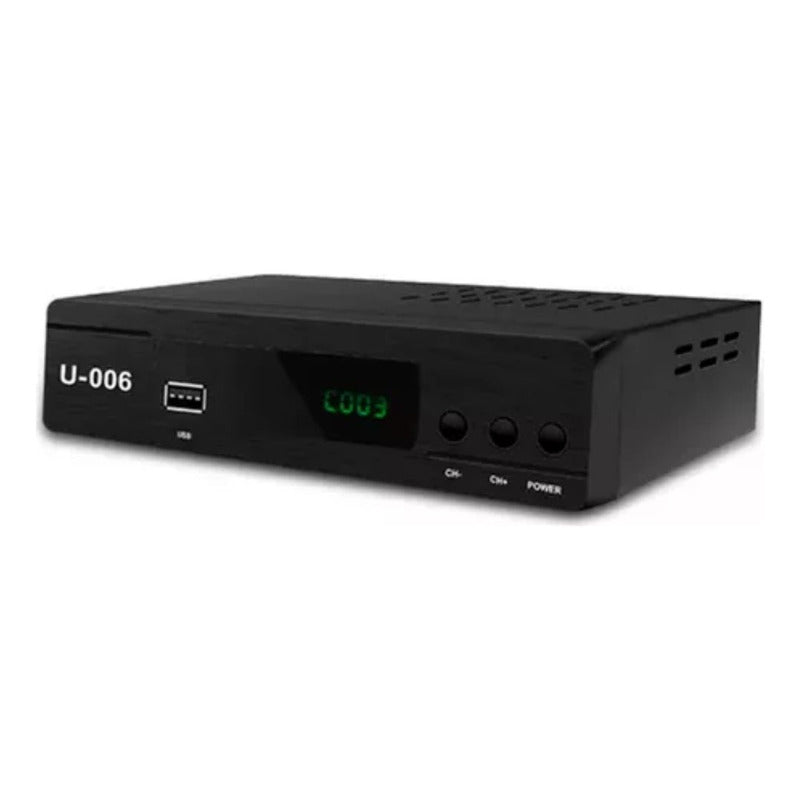 El Decodificador - Receptor - Sintonizador de TV digital full HD, ISDBT modelo U-006, es un producto especial para televisores que no cuentan con sintonizador de televisión digital y televisores que solo reciben televisión análoga (Sistema de televisión tradicional). Por lo que es apto para todo tipo de televisores, sin importar su antigüedad y que cuenten con entrada de audio/video HDMI y/o RCA. Permitirá que tu televisor muestre la imagen en la mejor calidad que tenga disponible (Según su tecnología), grabar contenidos y/o programación en almacenamiento USB externo y/o disco duro externo. También posee EPG, que muestra programación en línea (Siempre y cuando el canal sintonizado la este emitiendo dentro de su señal). El dispositivo también reproduce archivos de audio y/o video desde almacenamiento externo USB.