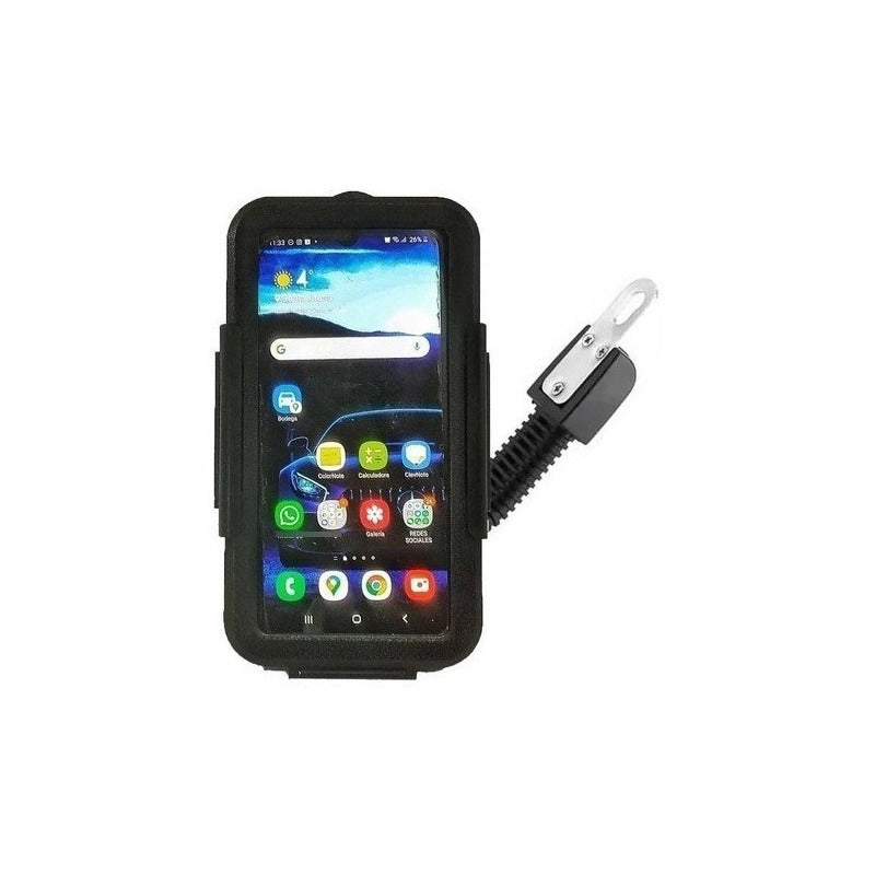 Soporte de celular para motocicleta diseñado para instalación en retrovisor, permitiendo acceso conveniente al teléfono durante la conducción. Particularmente útil para repartidores de delivery, este dispositivo técnico cuenta con sistema de ajuste personalizable, fabricación en plástico de alta resistencia, mecanismo de seguridad para fijación estable, estructura reforzada y estuche con protección impermeable integral para preservar su dispositivo en cualquier condición climática.