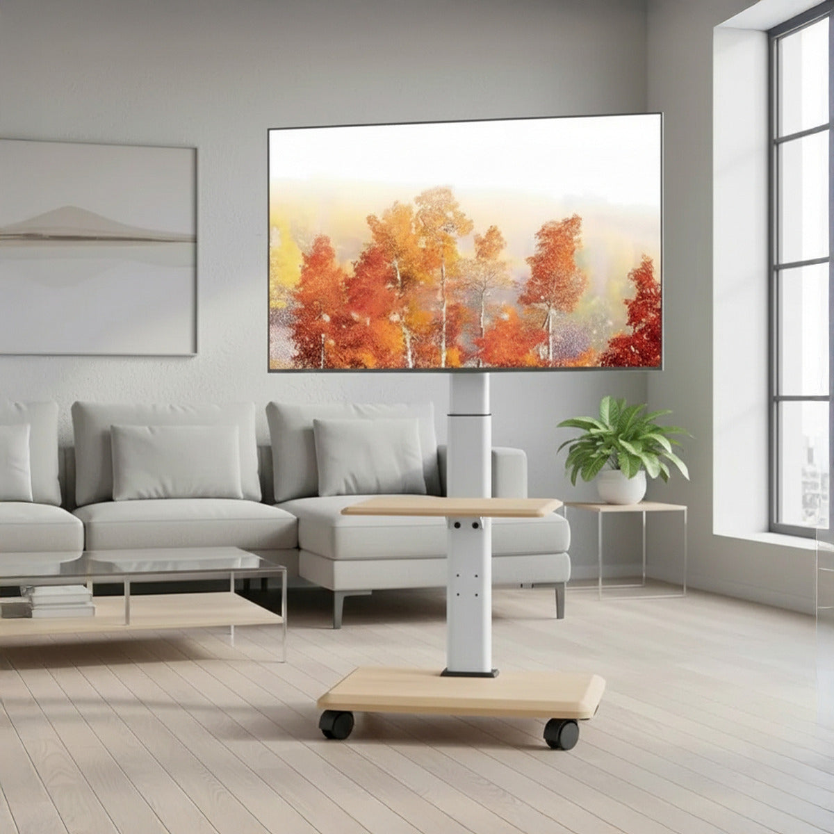 Ideal para oficinas, salas de reuniones, instituciones educativas o el hogar, este soporte con ruedas te permite desplazar y ajustar tu televisor sin esfuerzo, manteniendo siempre una instalación segura y ordenada. Su estructura robusta y su bandeja adicional lo convierten en una solución completa para quienes buscan funcionalidad y estilo.