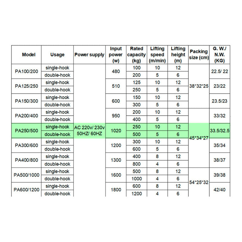 Cuerda simple de 12 metros, peso de elevación de 600 kg, velocidad de elevación: 10 metros/minuto.